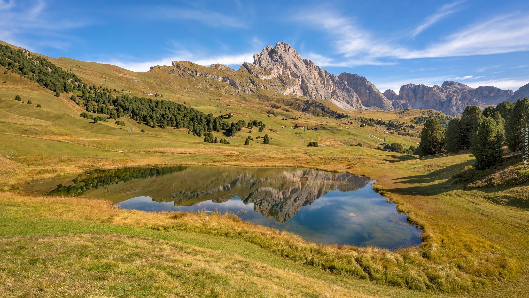 Edytor tapety: Jezioro na łące z widokiem na góry