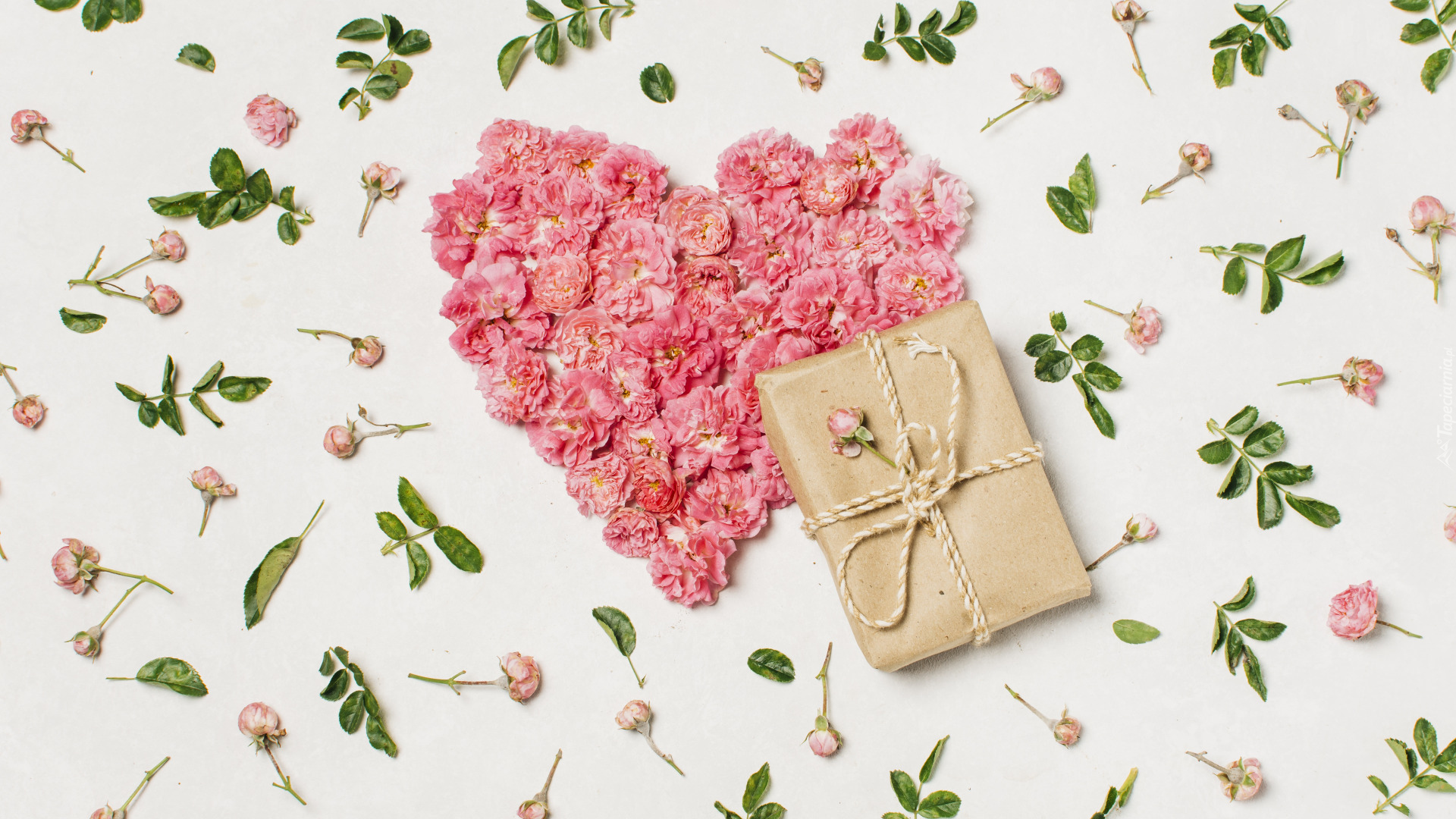 Edytor tapety: Prezent na sercu z róż na białym tle