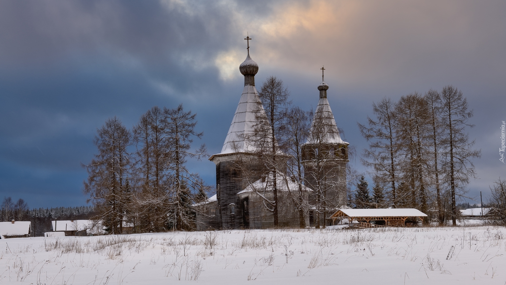 Edytor tapety: Ośnieżona cerkiew wśród drzew