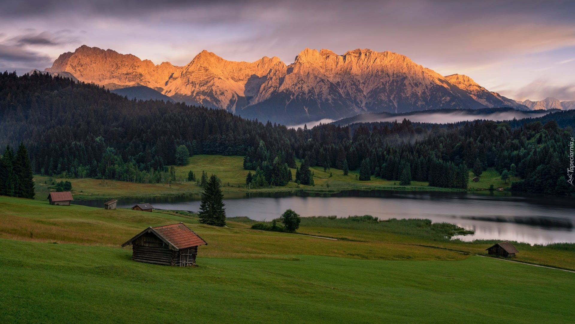 Edytor tapety: Góry Karwendel i domki nad jeziorem Geroldsee
