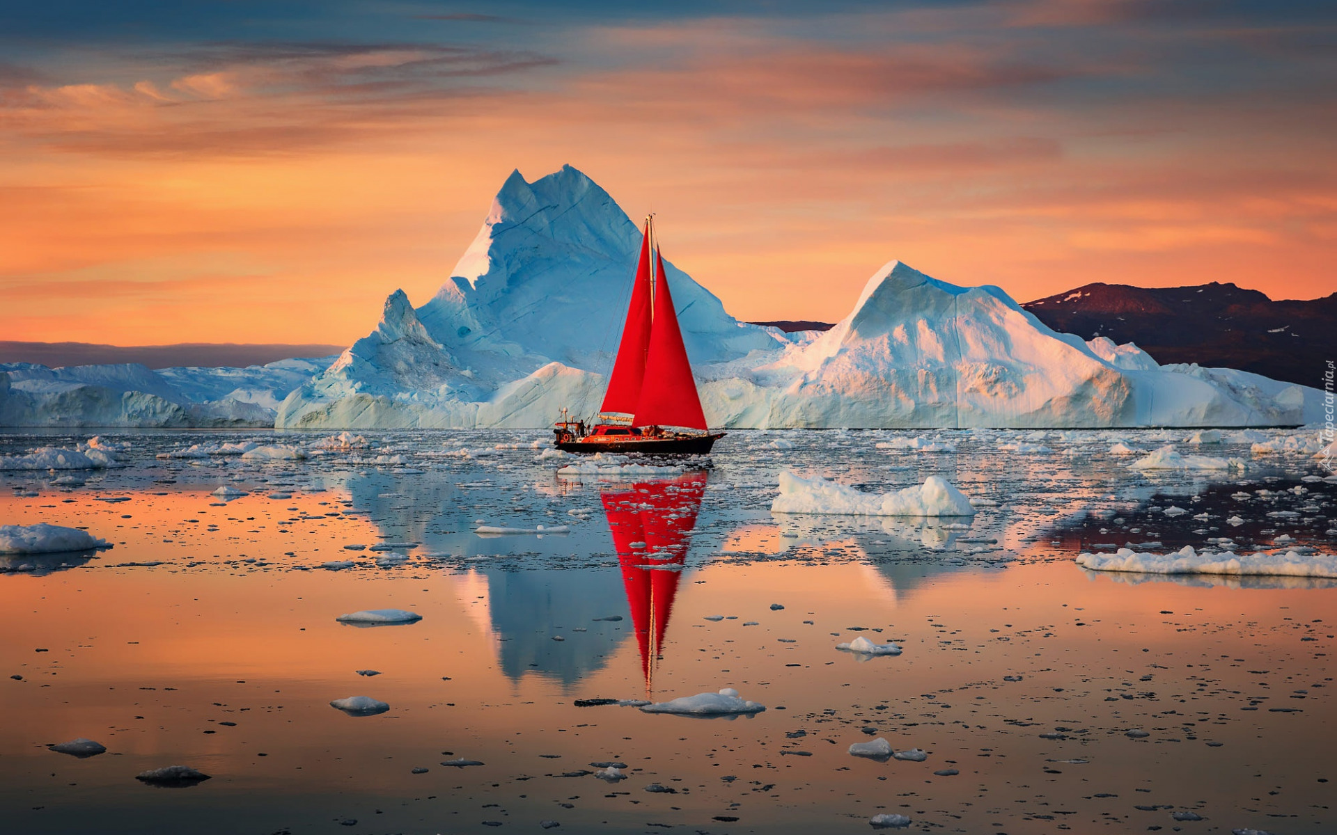 Edytor tapety: Żaglówka z czerwonymi żaglami na tle gór lodowych