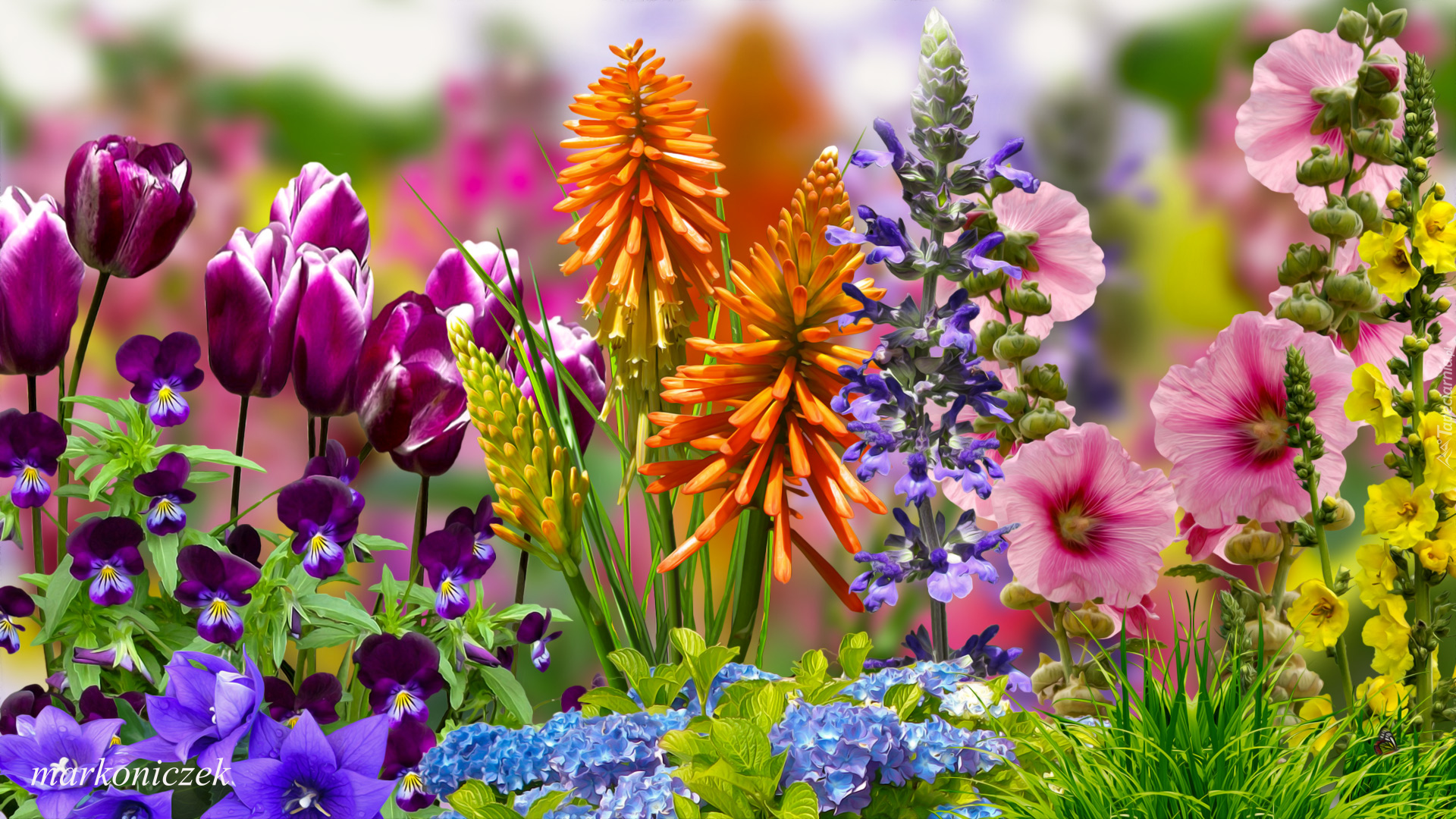 Edytor tapety: Kolorowe kwiaty i trawa w grafice