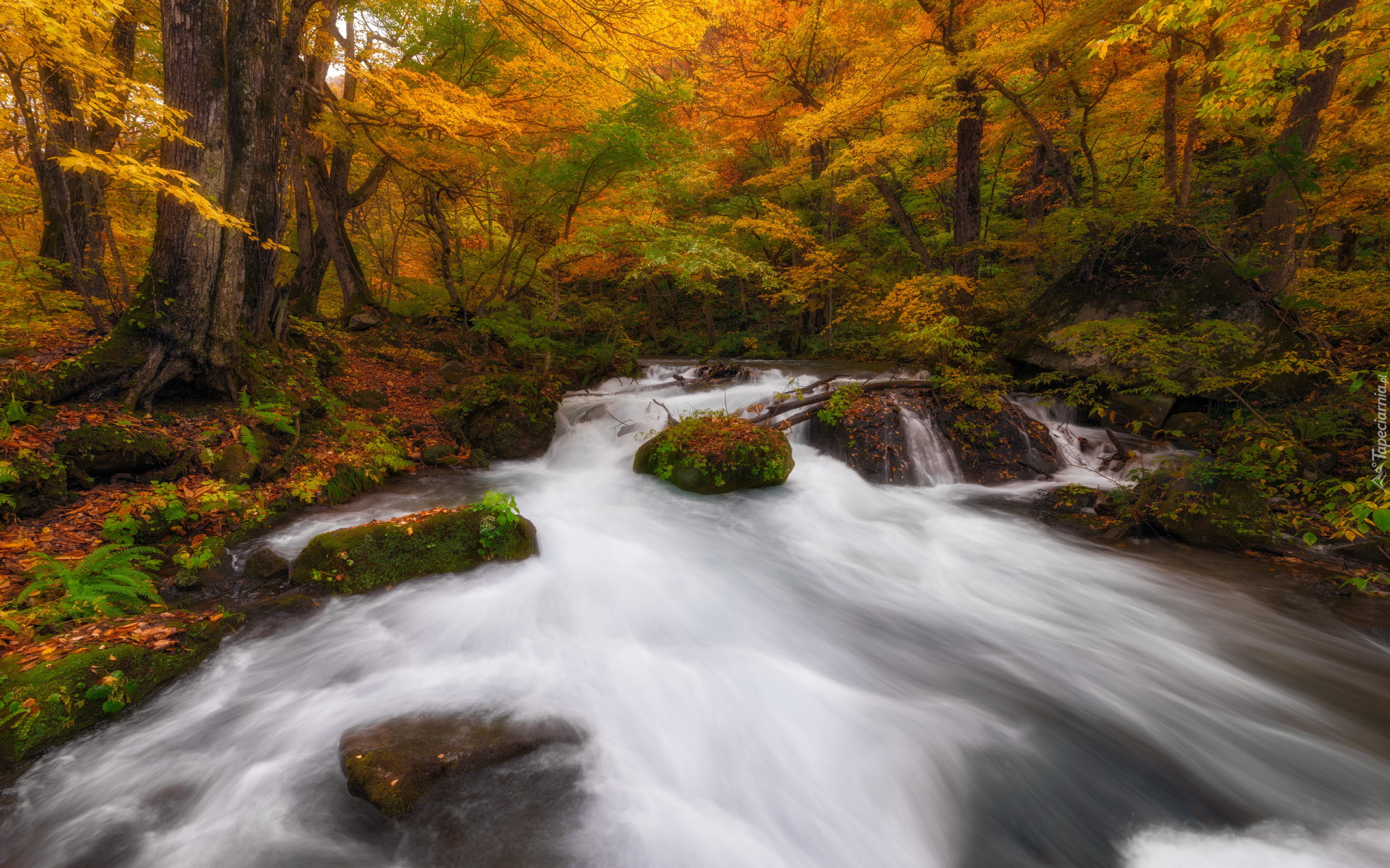 Edytor tapety: Pożółkłe drzewa i omszałe skały nad leśną rzeką