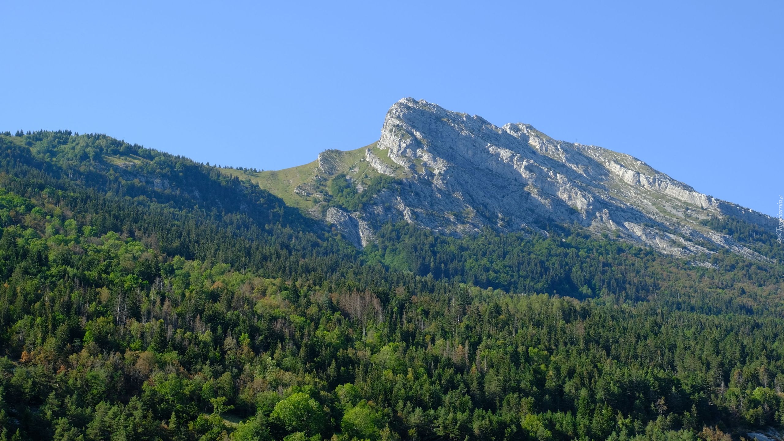 Edytor tapety: Zielone lasy na tle skalistych gór