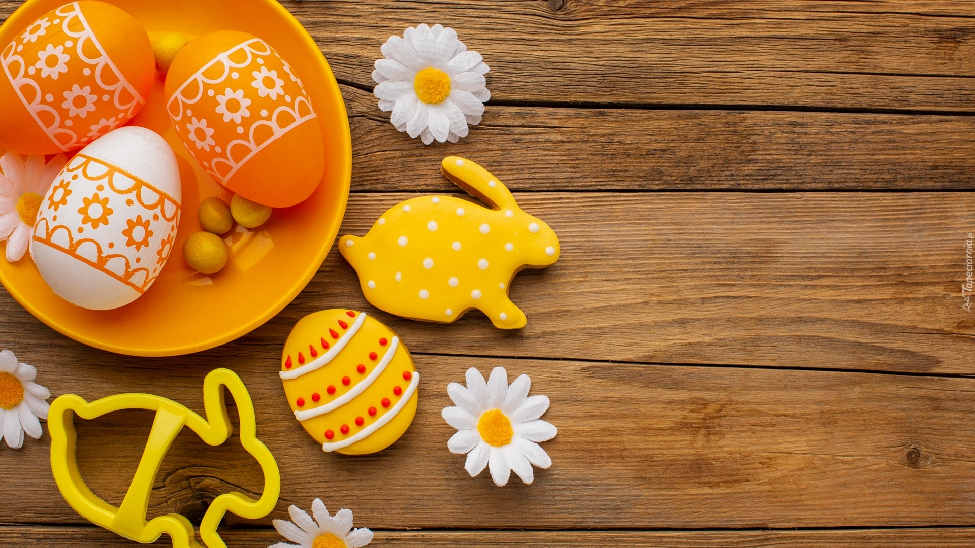 Edytor tapety: Zające i stokrotki obok pisanek na talerzu