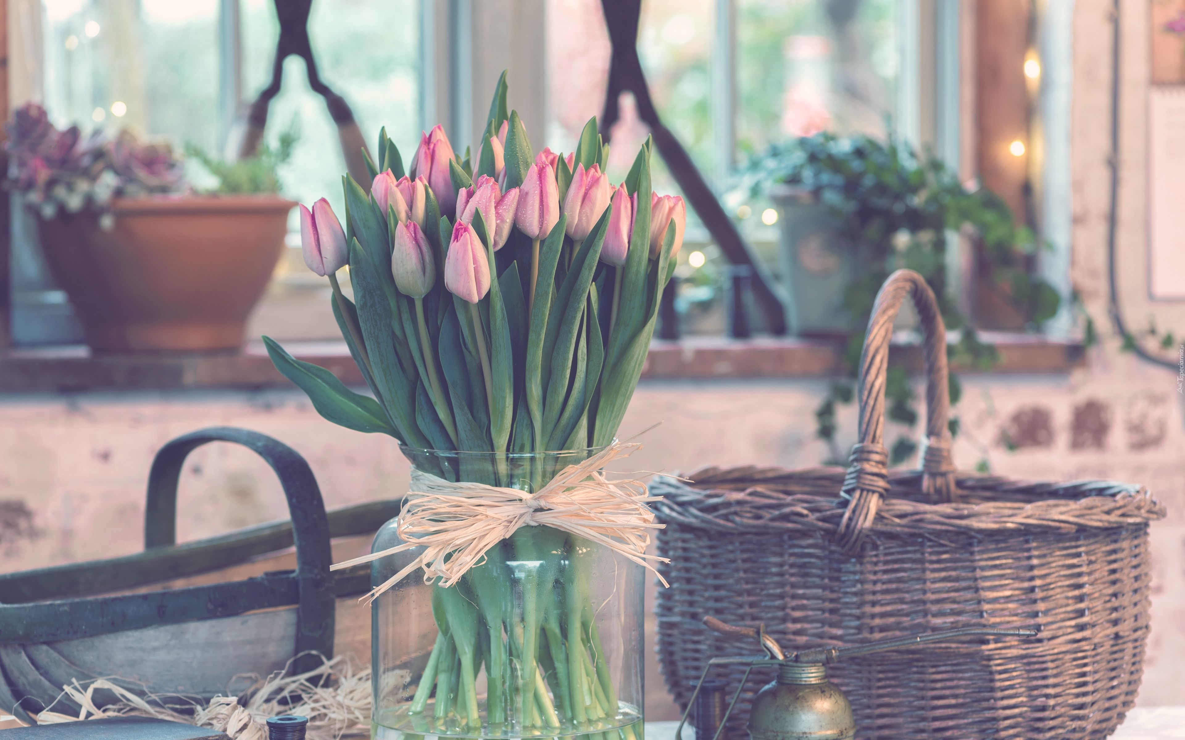 Edytor tapety: Bukiet różowych tulipanów w wazonie obok koszyków