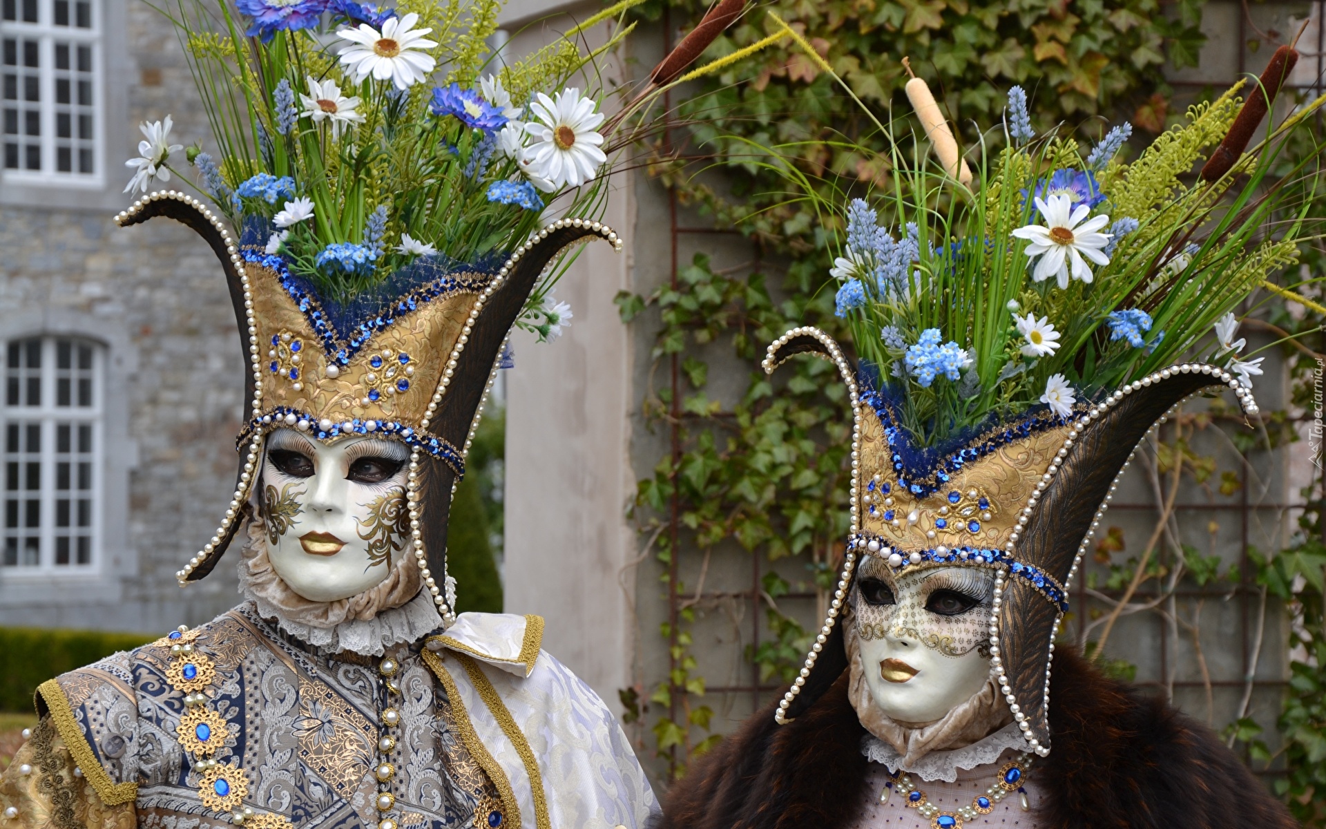Edytor tapety: Ludzie w maskach i kapeluszach z kwiatami