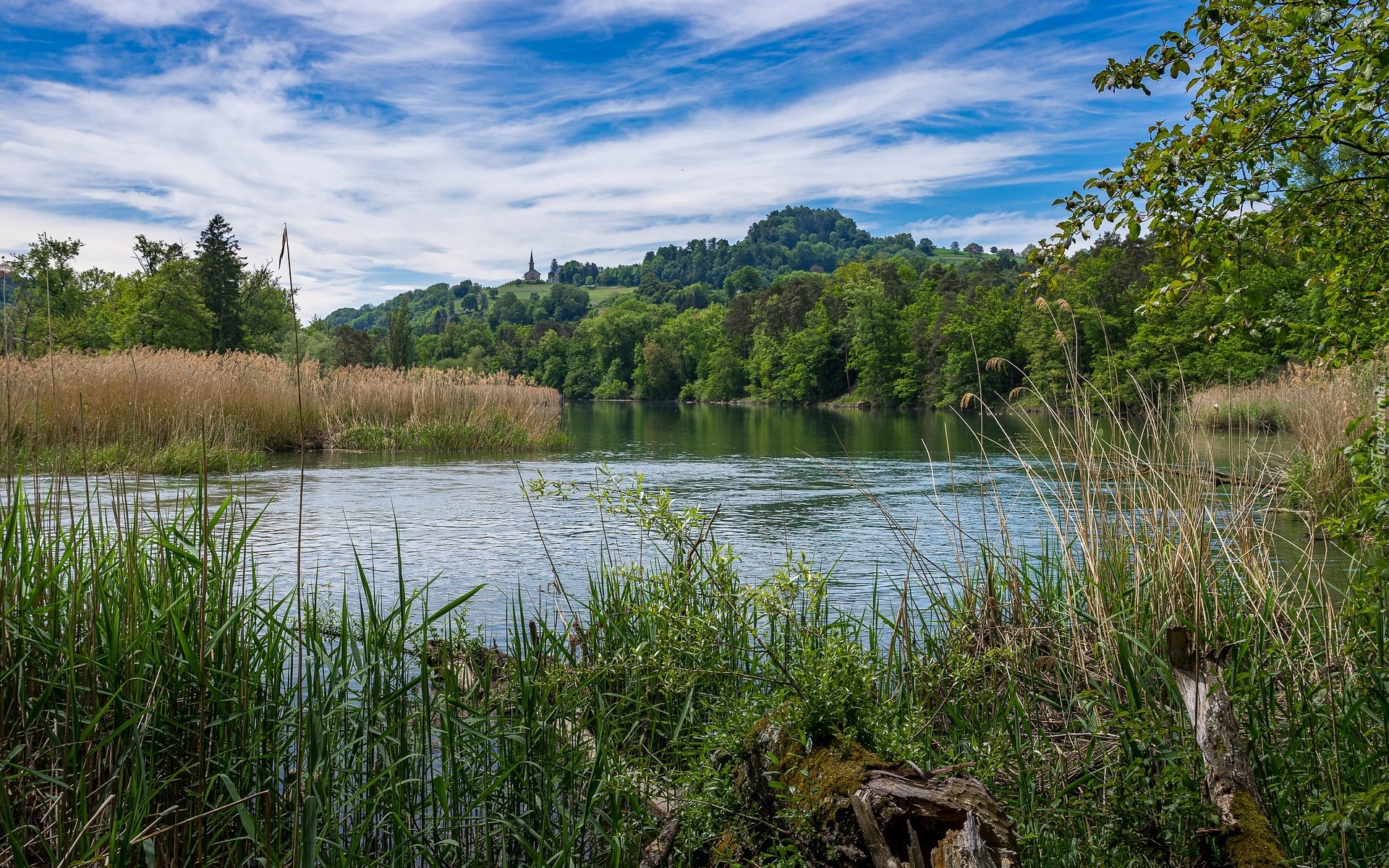 Edytor tapety: Wysokie pożółkłe trawy i zielone drzewa nad rzeką