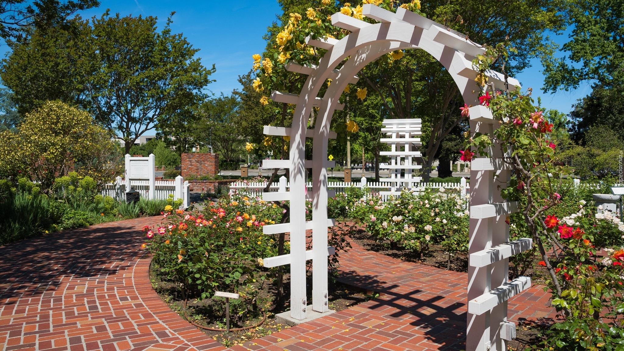 Edytor tapety: Pergole i róże przy brukowanej ścieżce w ogrodzie