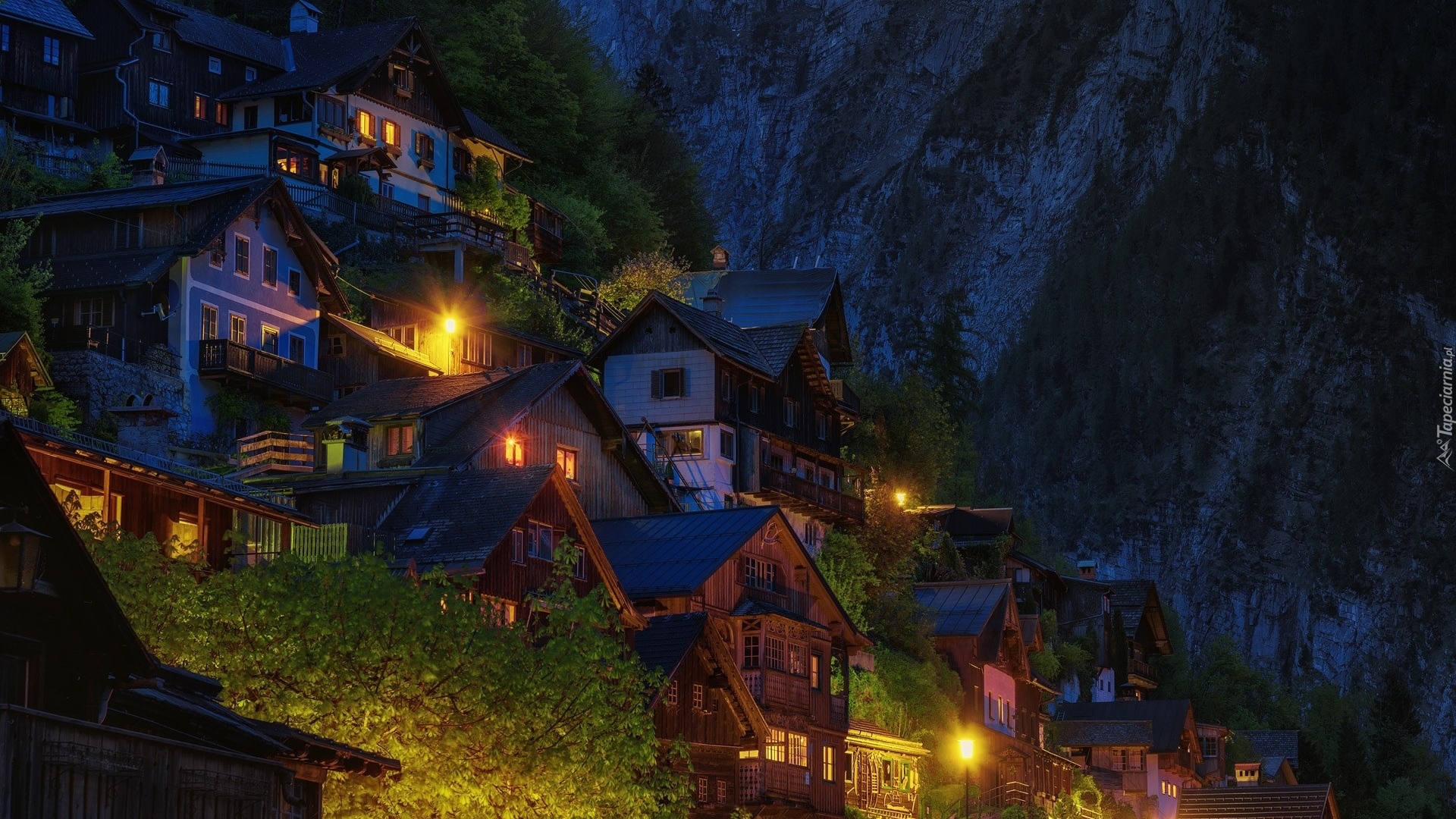 Edytor tapety: Oświetlone domy na zboczu góry w Hallstatt