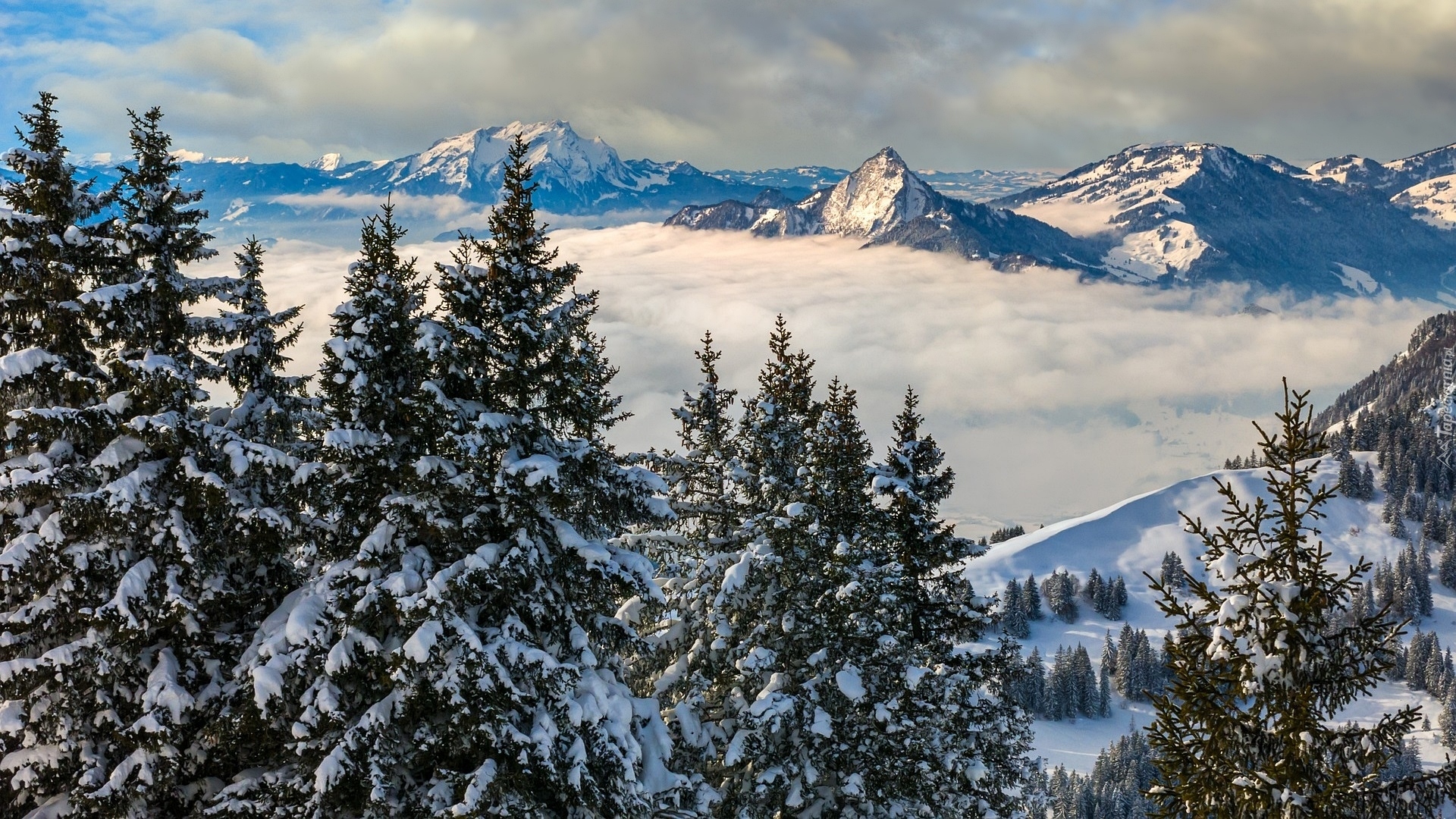 Edytor tapety: Ośnieżone drzewa i gęsta mgła nad górami