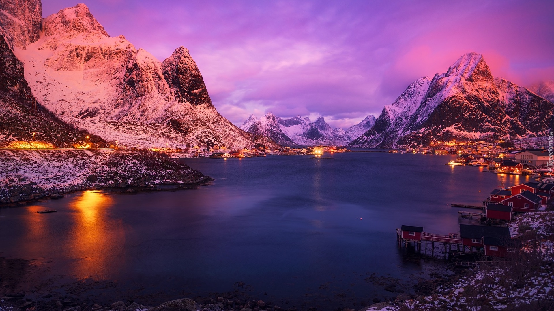 Edytor tapety: Oświetlona wioska Reine i ośnieżone góry