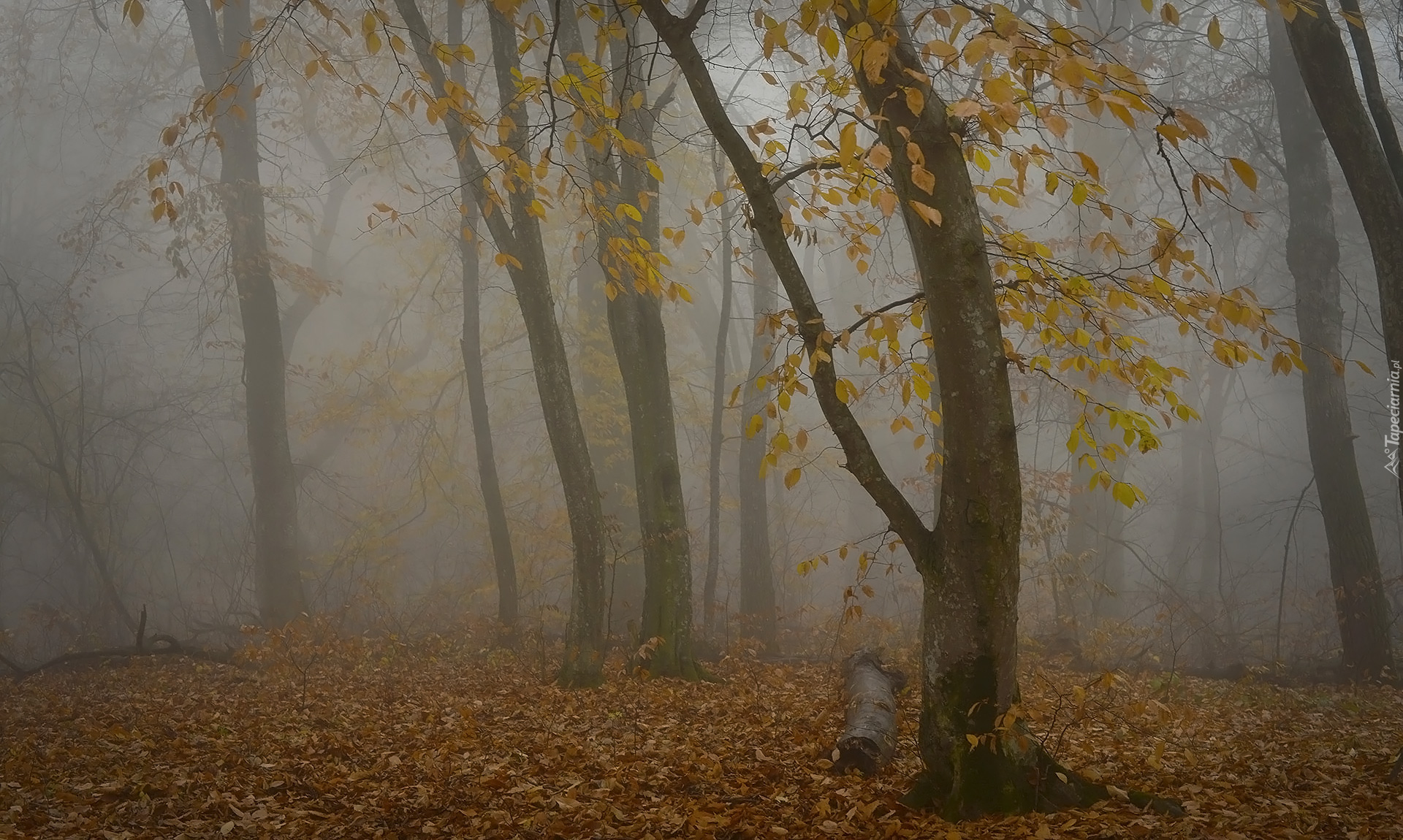 Edytor tapety: Opadłe liście pod drzewami w zamglonym jesiennym lesie