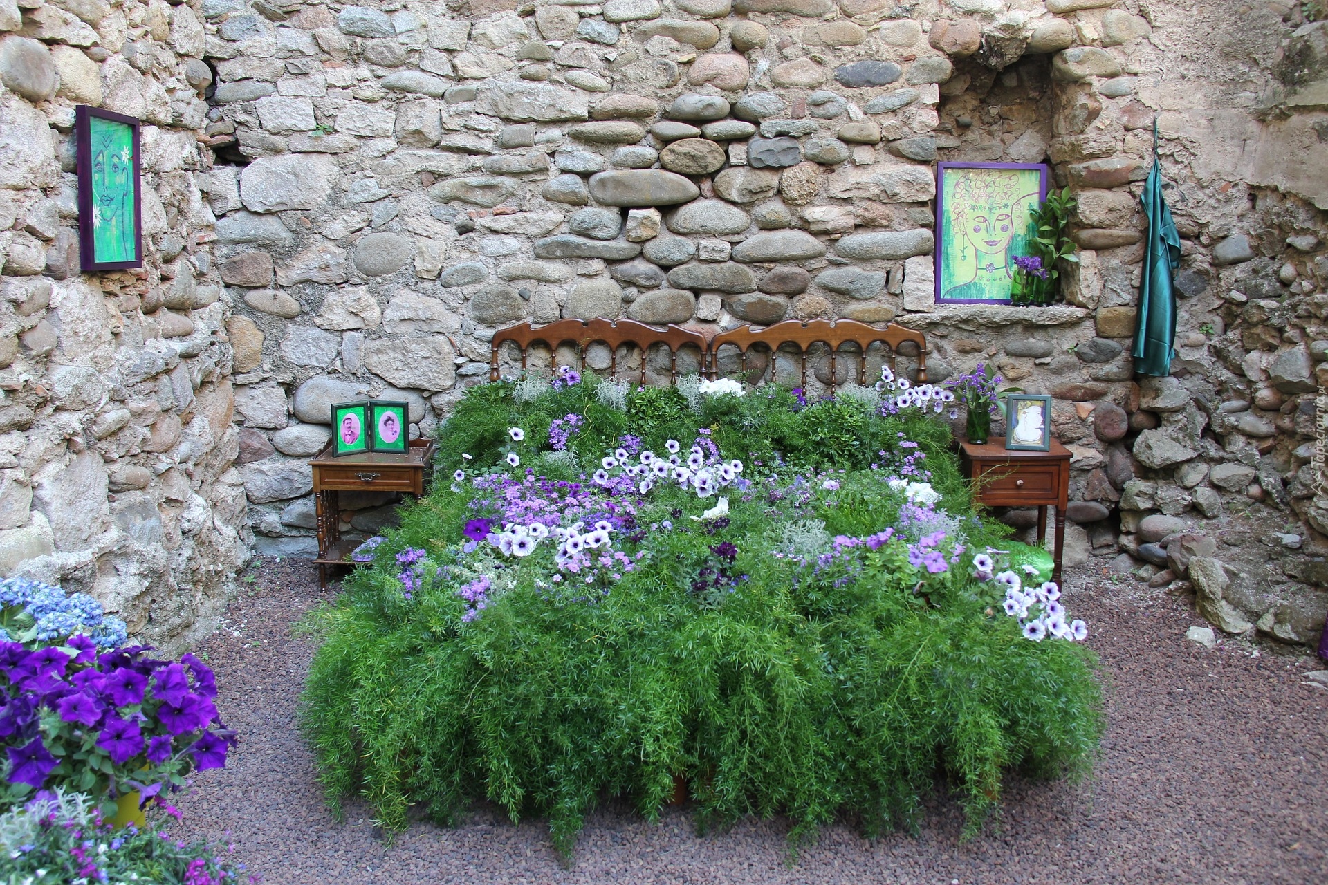 Edytor tapety: Łóżko zasłane kwiatami pod murem w ogrodzie