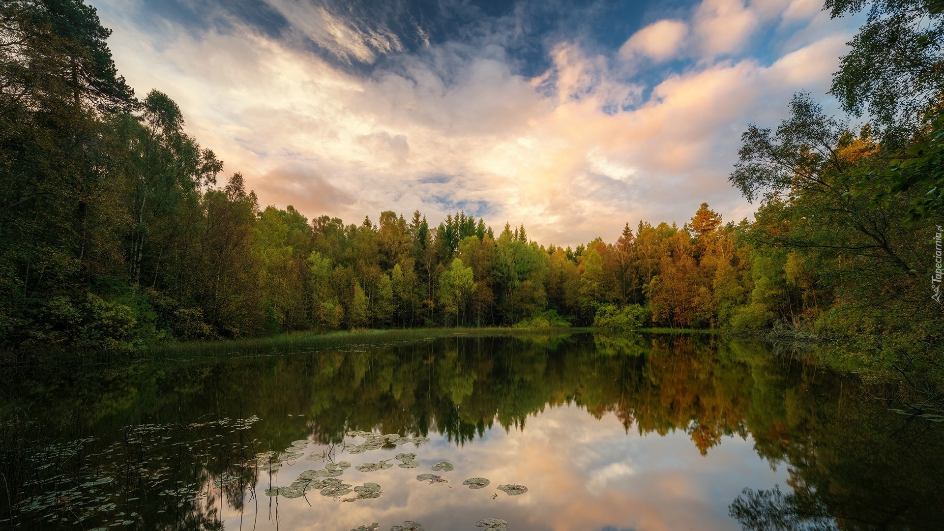 Edytor tapety: Zielone i pożółkłe drzewa wokół jeziora