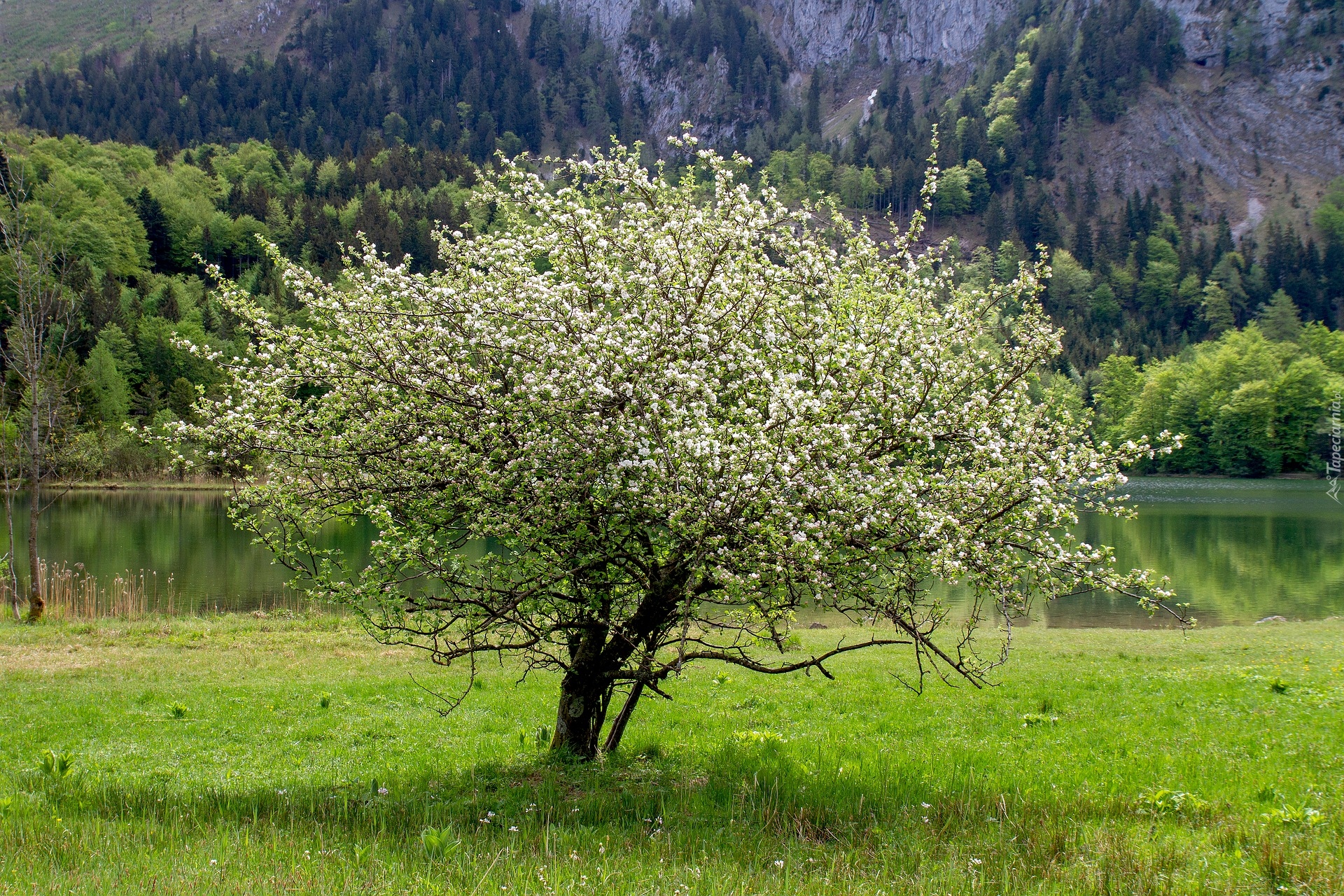 Edytor tapety: Okwiecone drzewo na łące