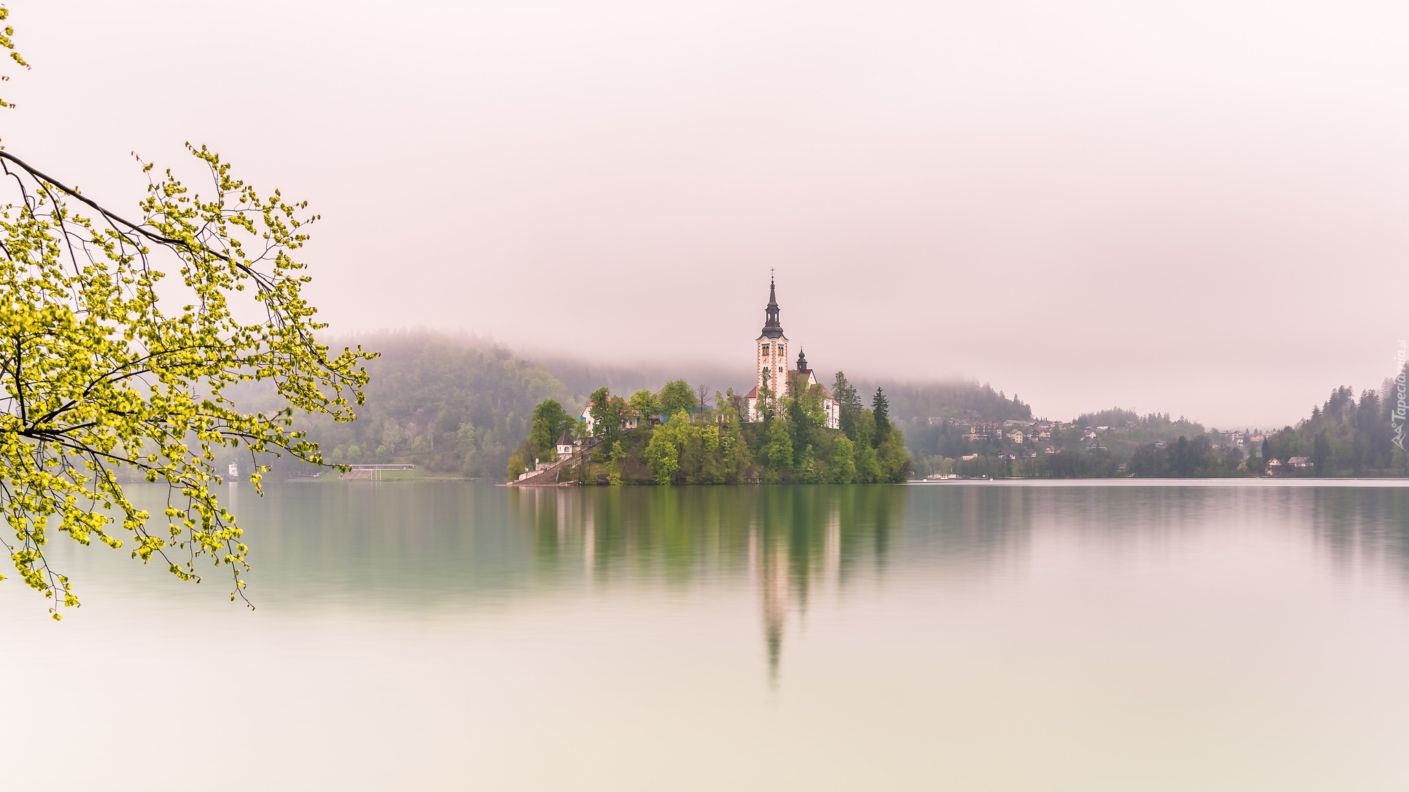 Edytor tapety: Kościół wśród drzew na wyspie Blejski Otok