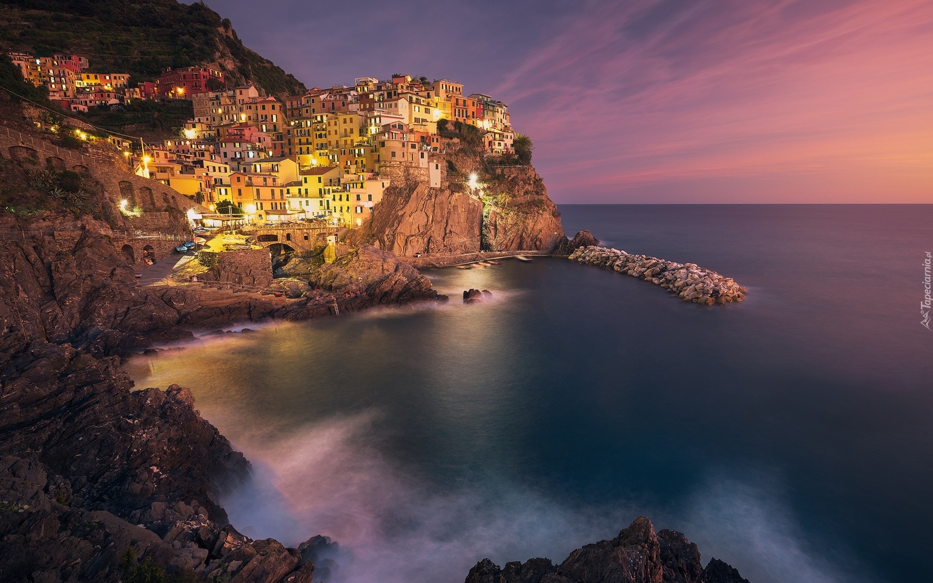Edytor tapety: Oświetlona o zmierzchu Manarola nad Morzem Liguryjskim
