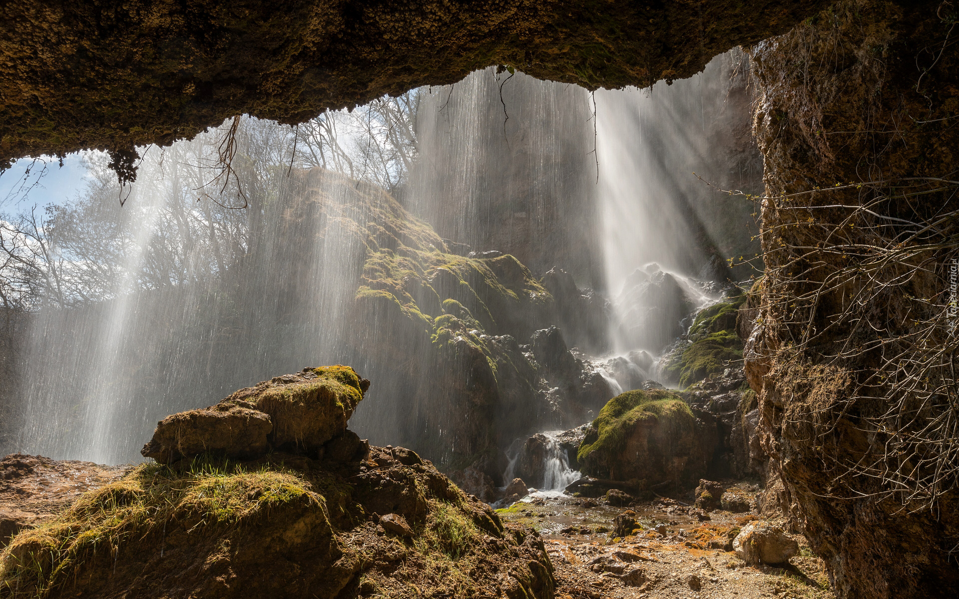Edytor tapety: Widok na wodospad spływający z omszałych skał