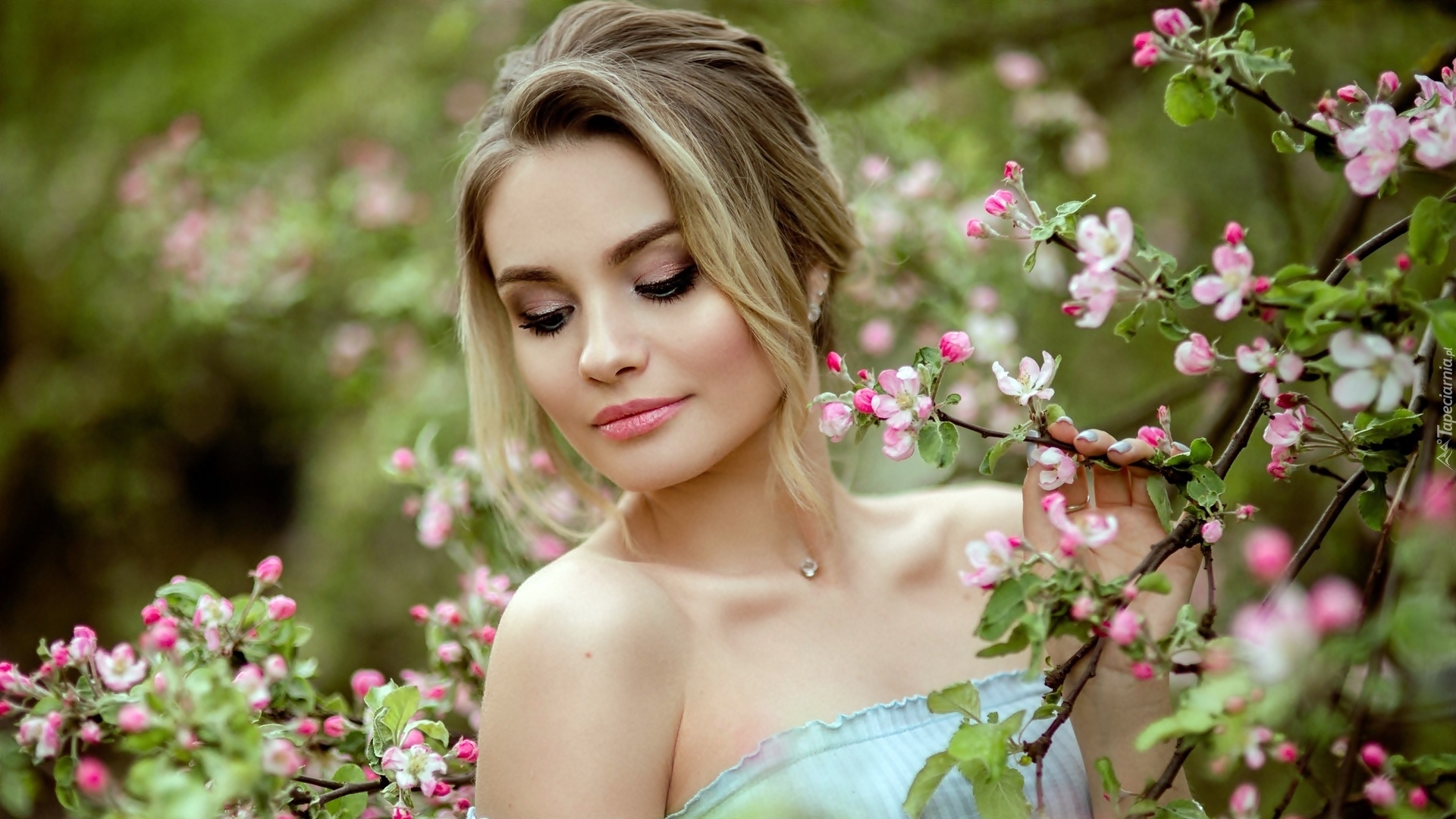 Edytor tapety: Blondynka obok okwieconej gałązki