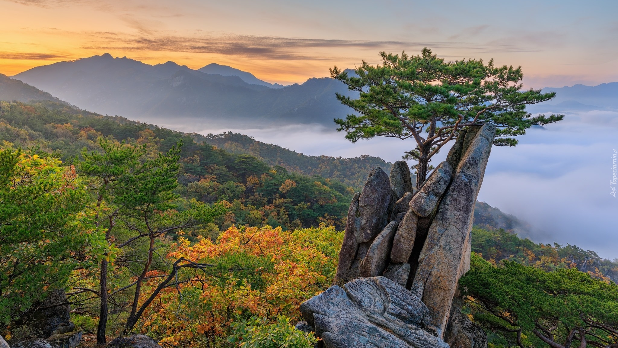 Edytor tapety: Zielona sosna na skałach