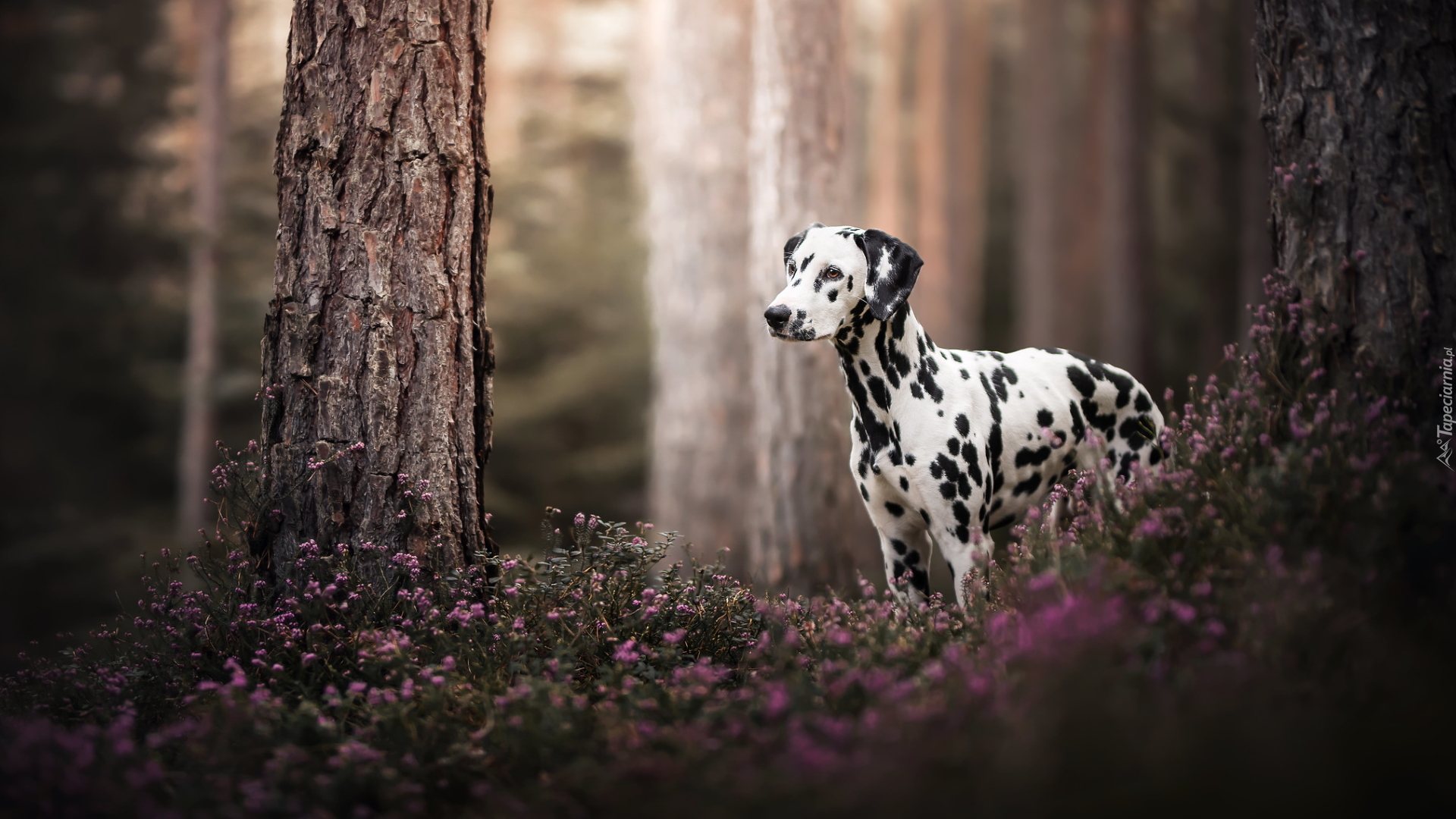 Edytor tapety: Dalmatyńczyk obok drzew w lesie