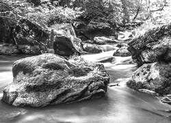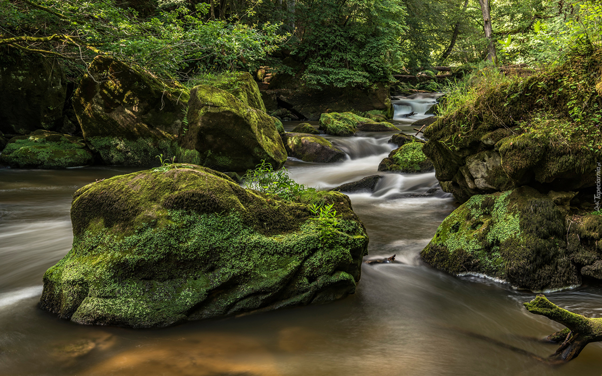 Edytor tapety: Omszałe głazy w leśnym potoku