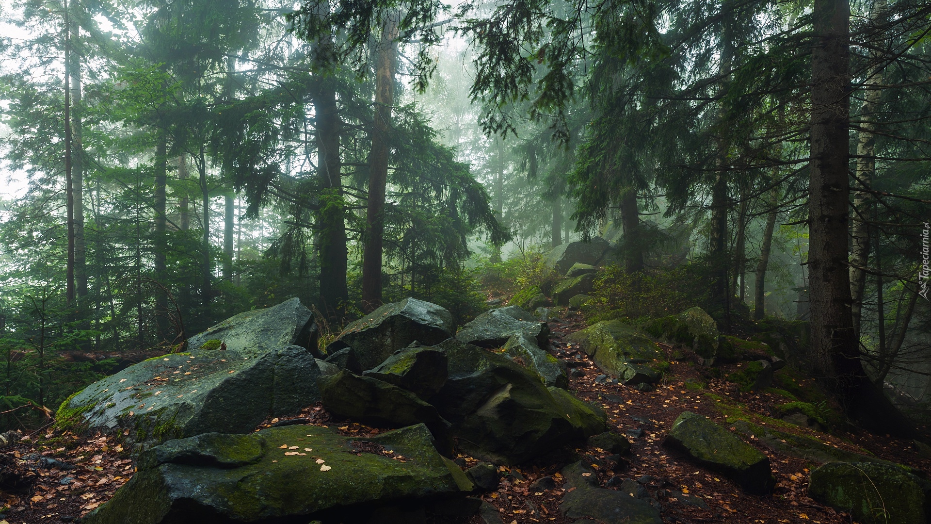 Edytor tapety: Omszone kamienie pod drzewami w lesie