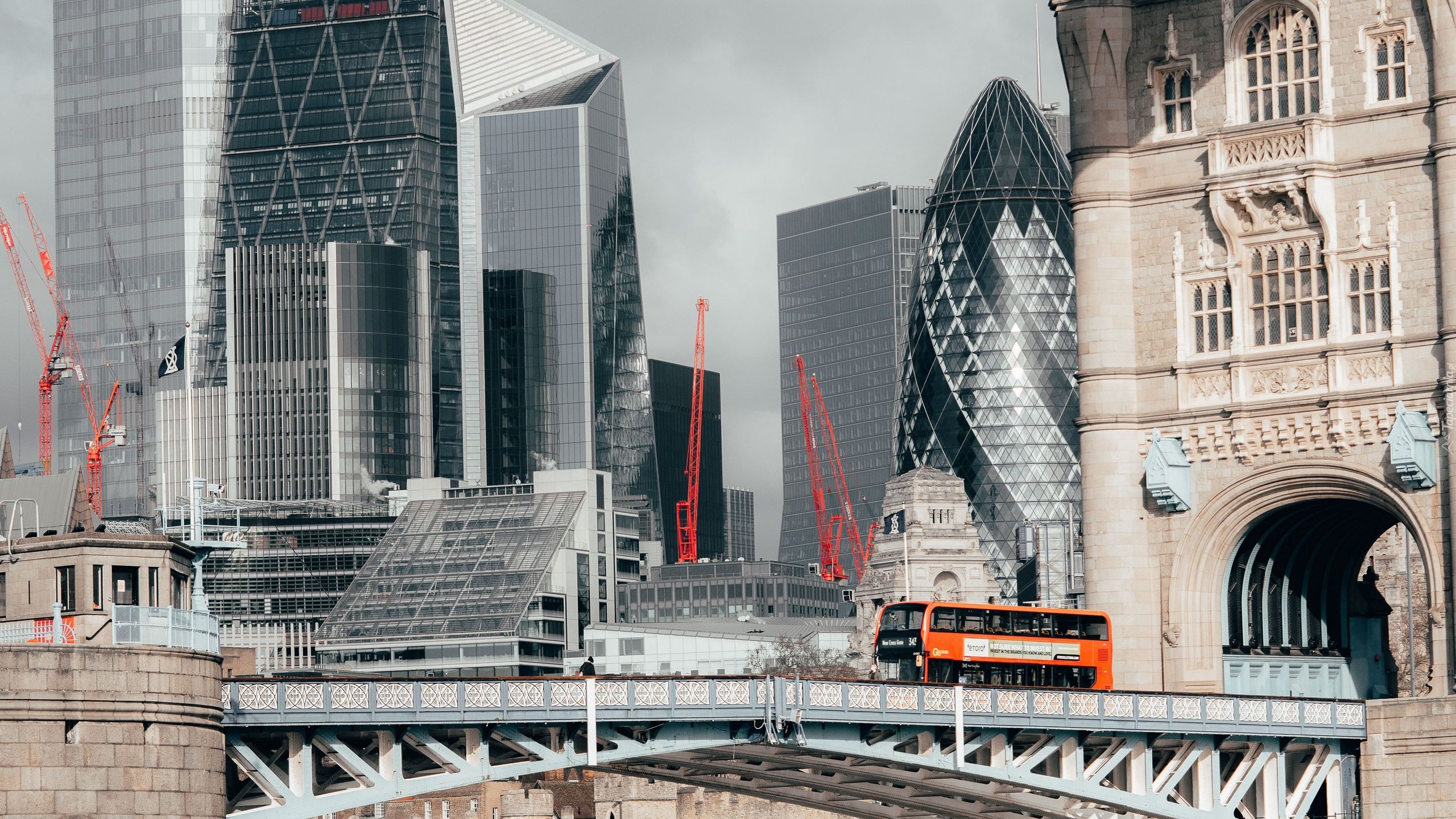 Edytor tapety: Autobus na wiadukcie wśród wieżowców w Londynie