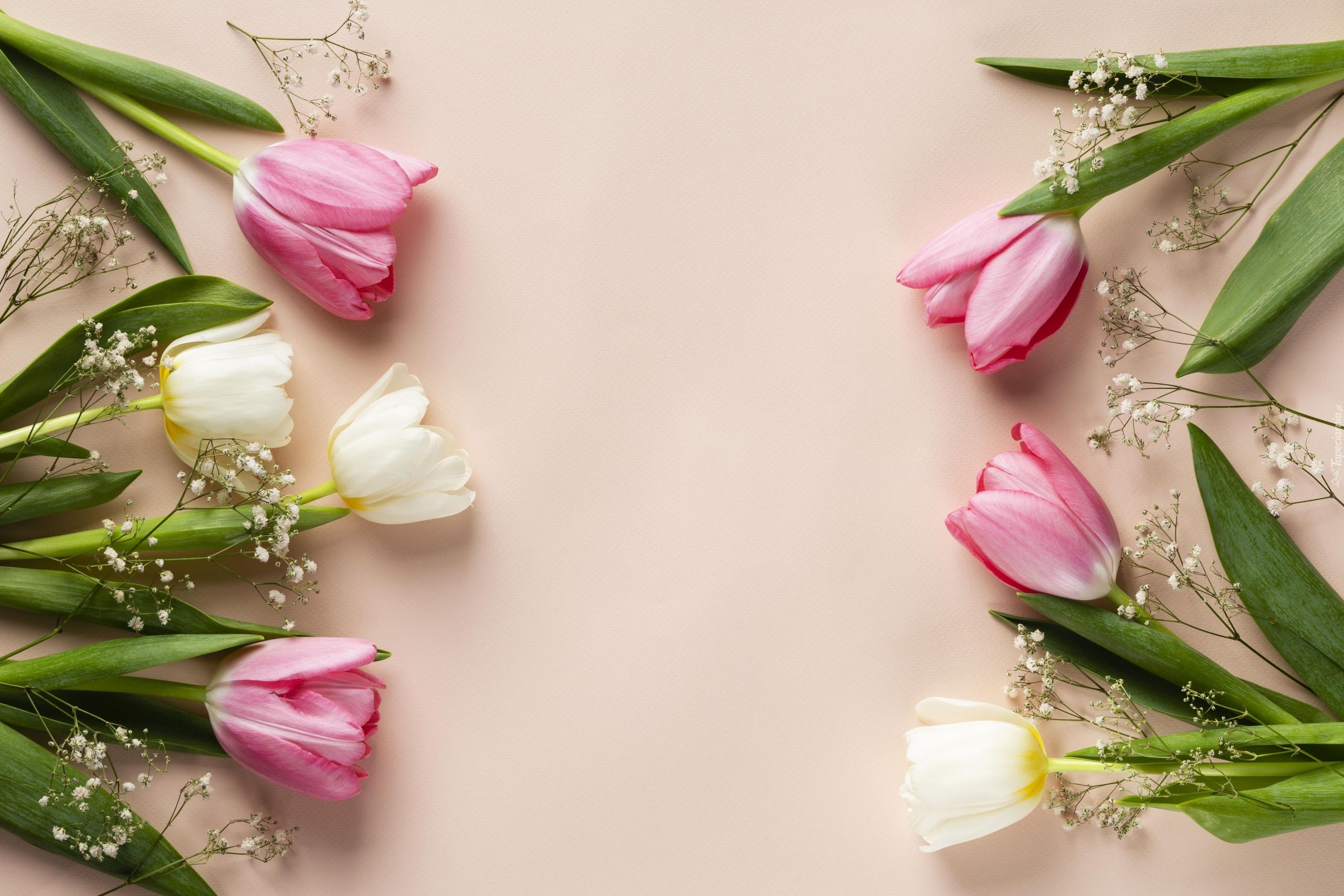 Edytor tapety: Kolorowe tulipany i gipsówka na jasnym tle
