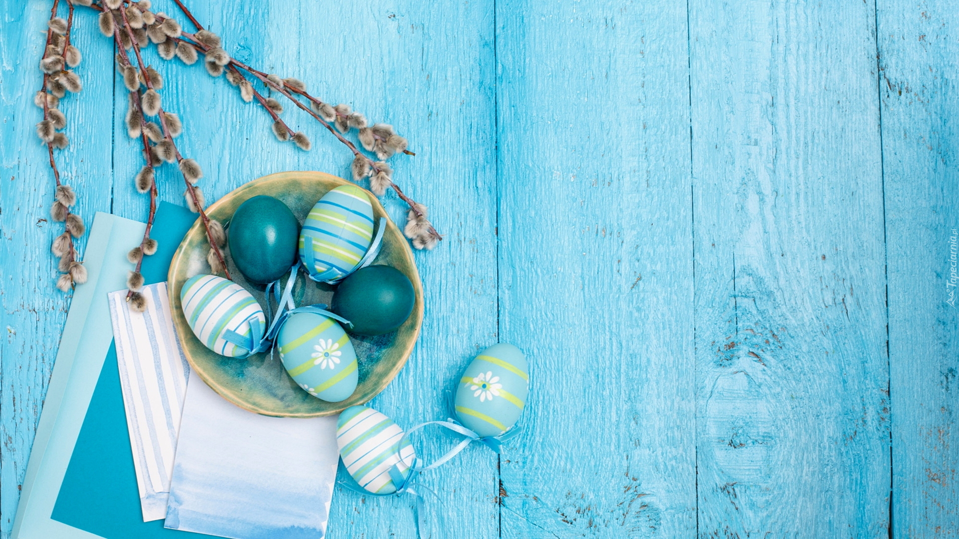 Edytor tapety: Bazie i pisanki na niebieskich deskach