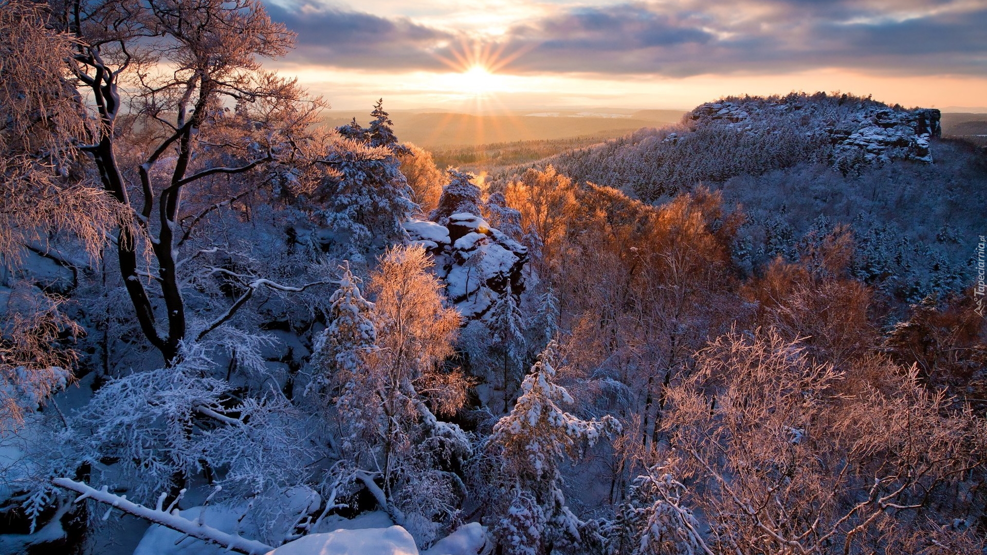 Edytor tapety: Ośnieżone drzewa i skały w słonecznych promieniach