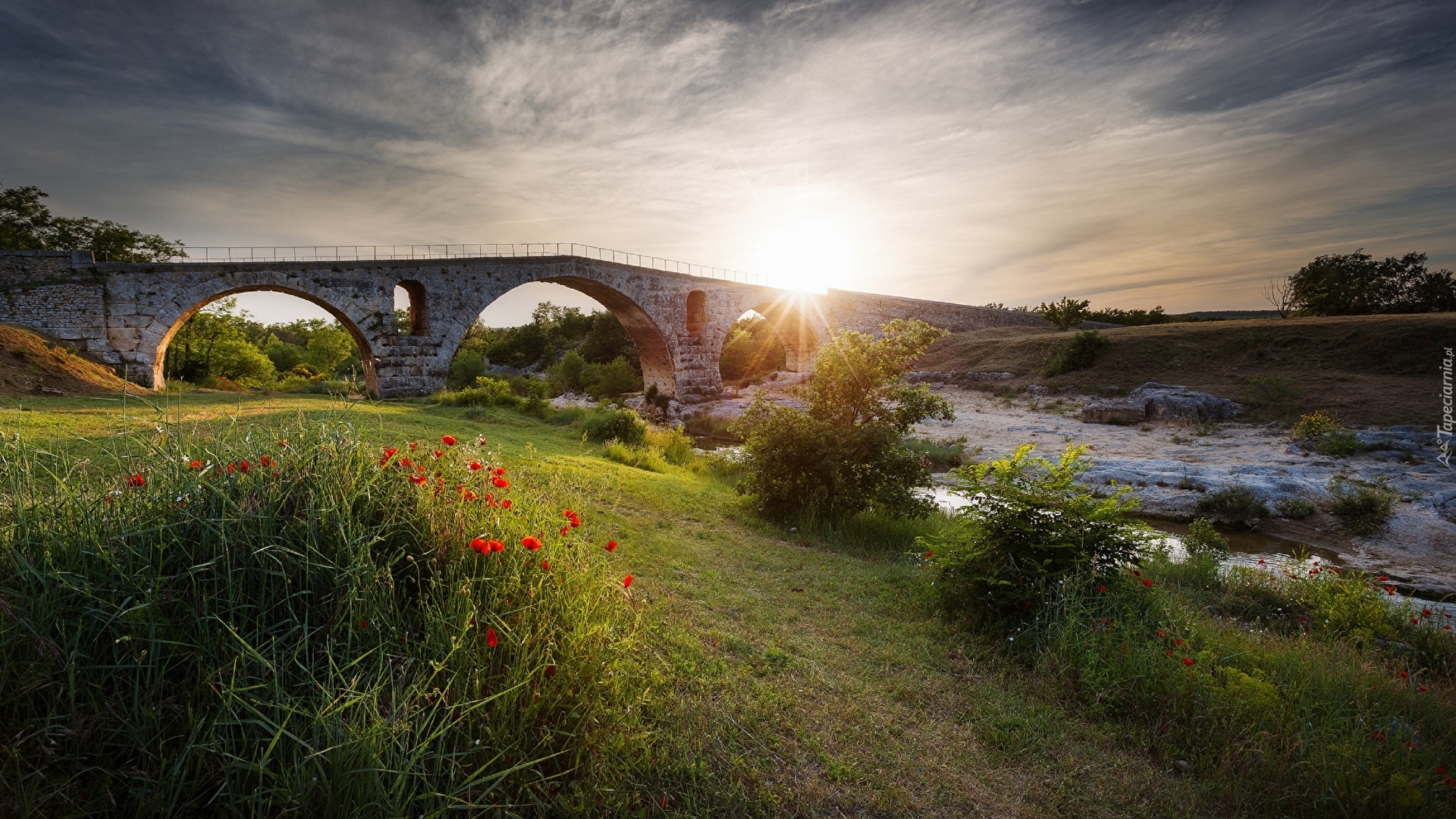 Edytor tapety: Krzewy i maki w pobliżu mostu na rzece