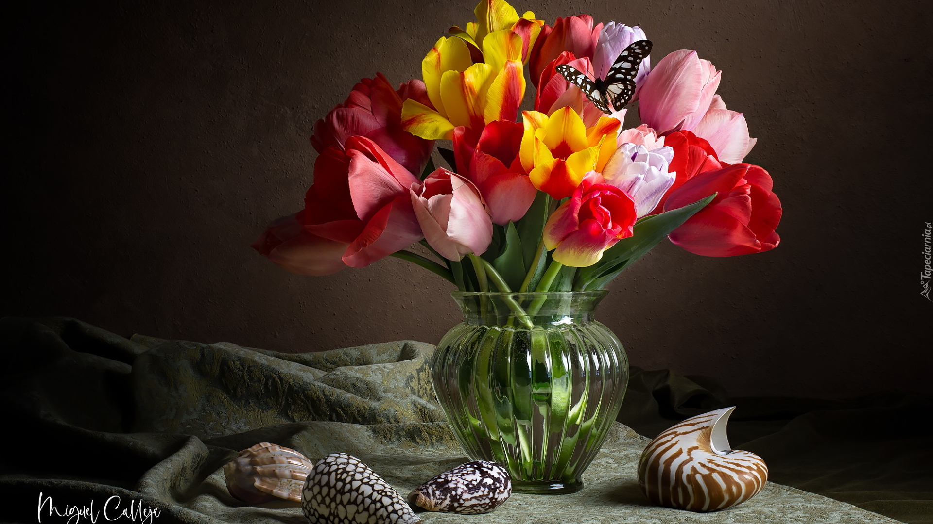 Edytor tapety: Tulipany w szklanym wazonie pośród muszelek