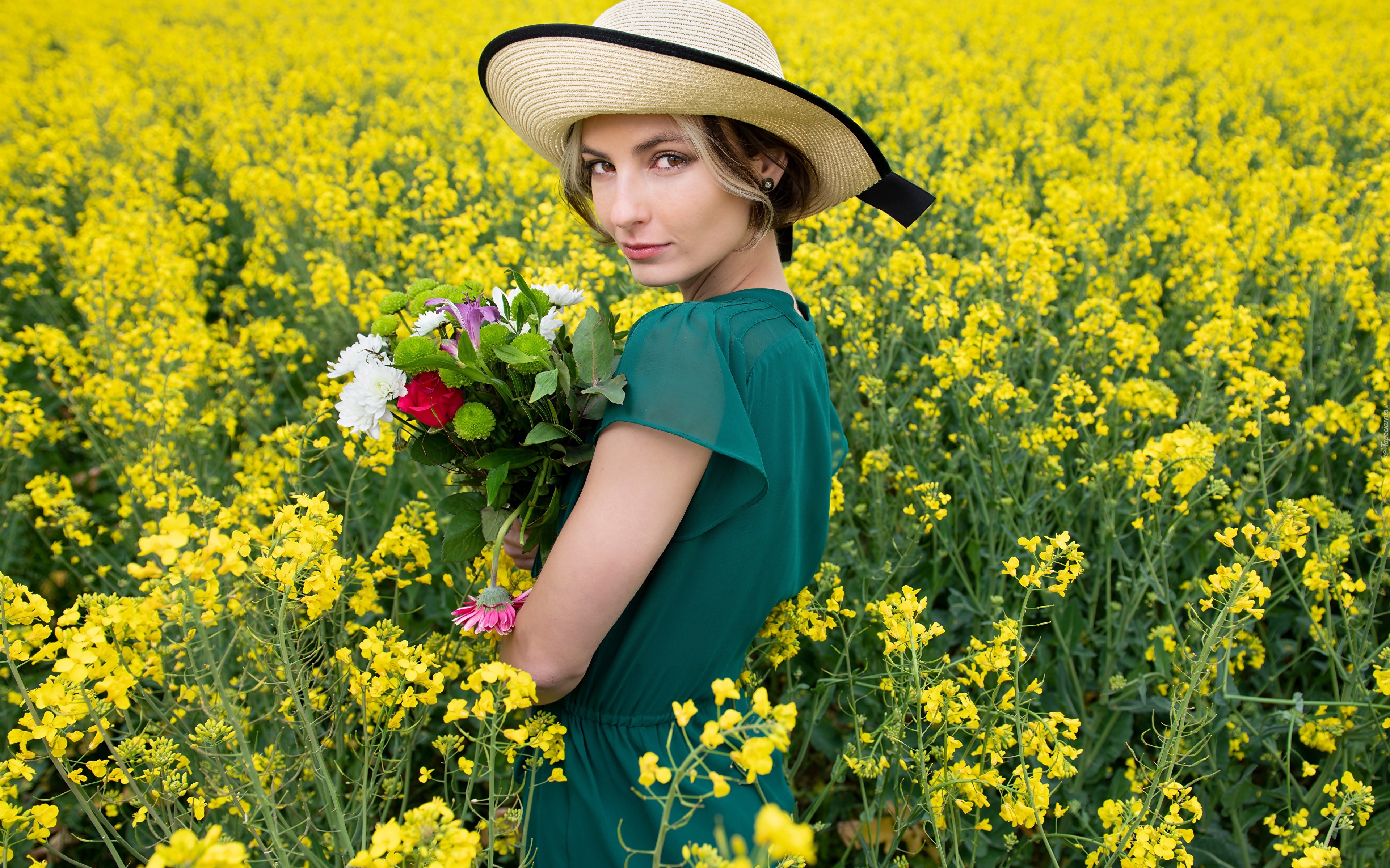Edytor tapety: Kobieta w kapeluszu na polu rzepakowym