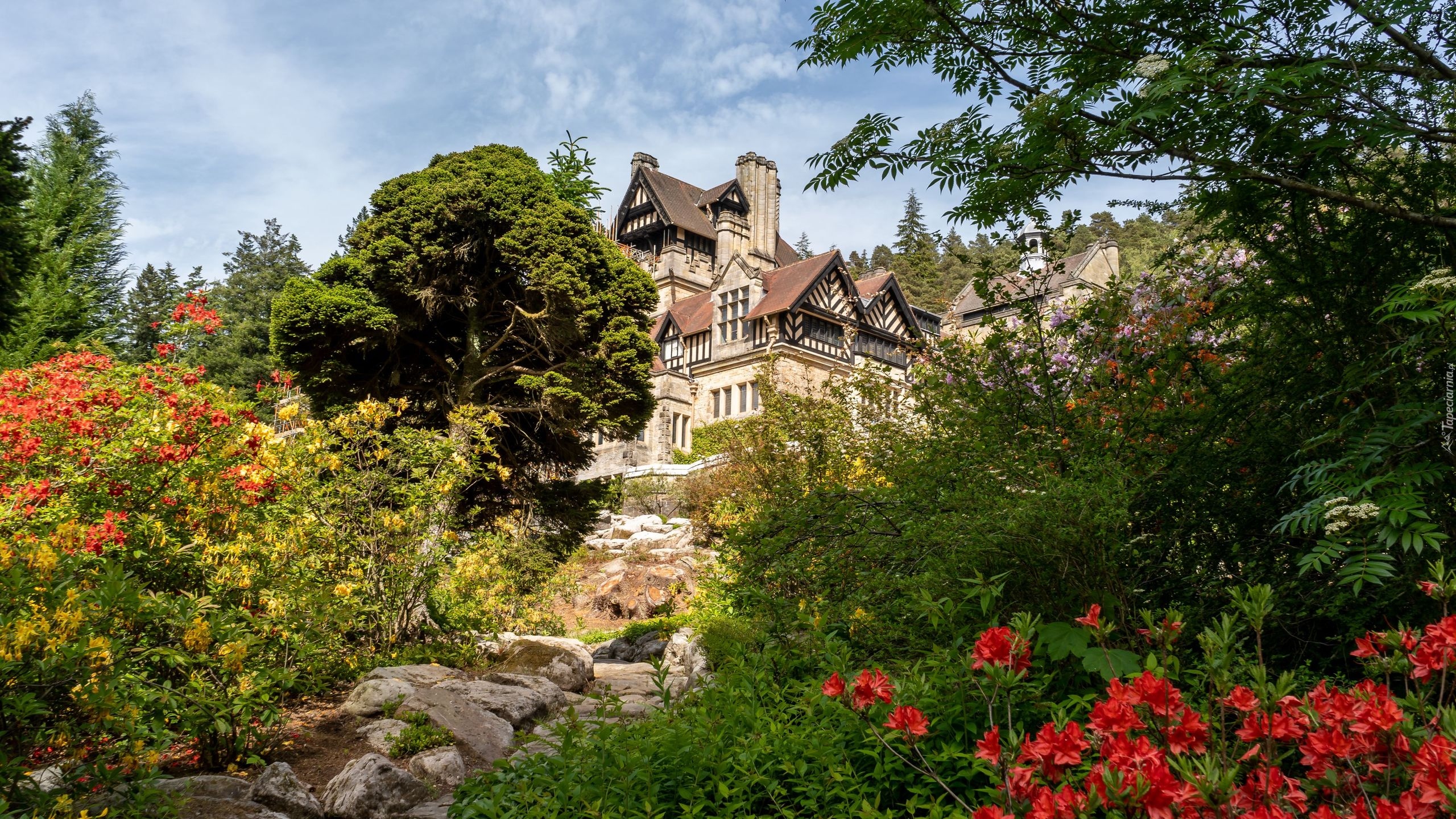 Edytor tapety: Dom wśród drzew i kwitnących krzewów