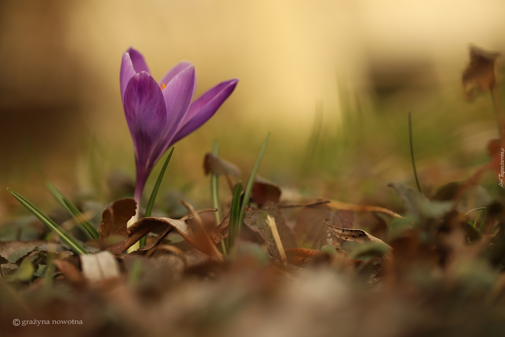 Edytor tapety: Rozkwitnięty fioletowy krokus w suchych liściach