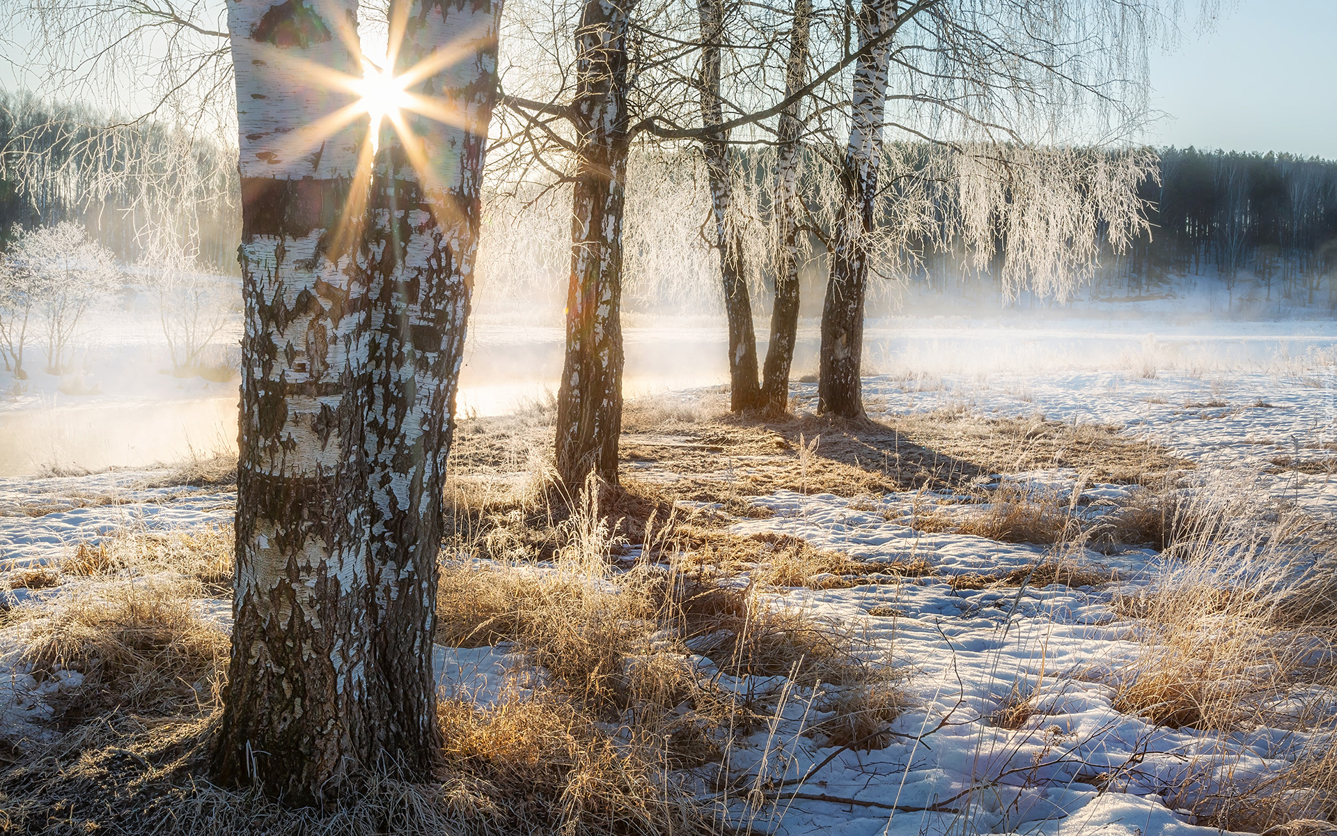 Edytor tapety: Oszronione brzozy i trawy w promieniach słońca
