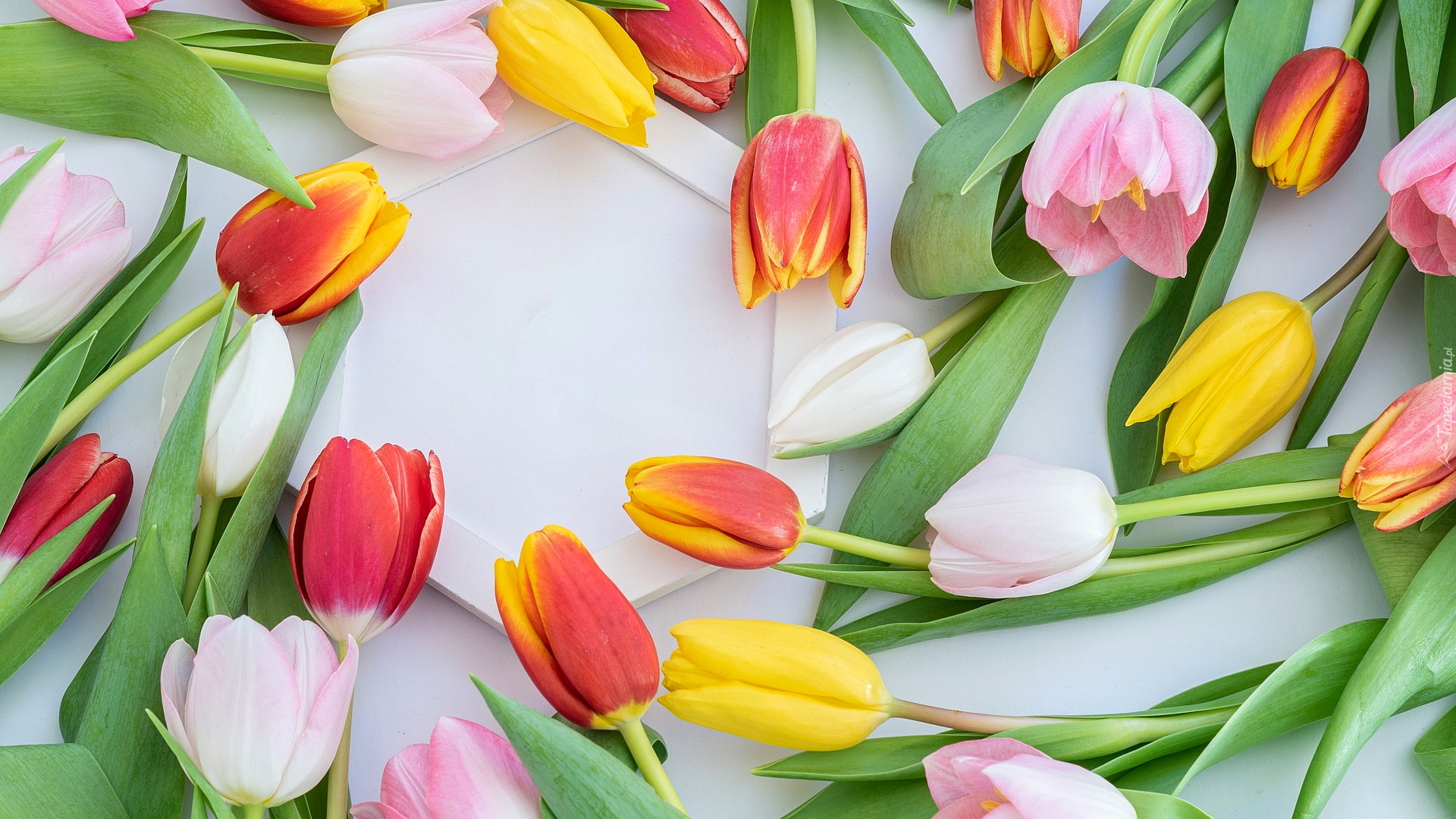 Edytor tapety: Kolorowe tulipany na białej ramce