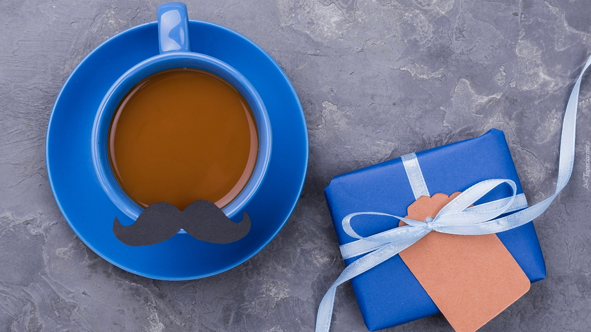 Edytor tapety: Prezent i kawa dla taty na szarym tle