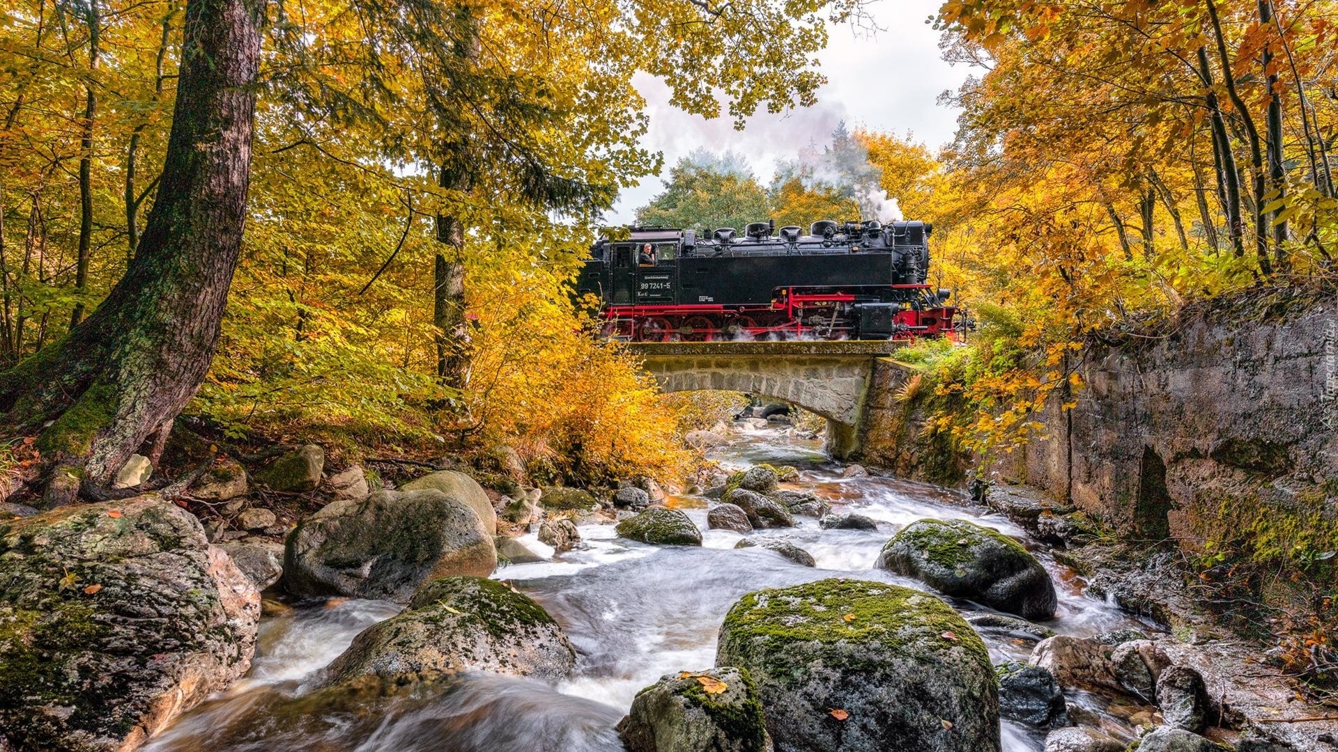 Edytor tapety: Lokomotywa na moście nad rzeką w jesiennej scenerii