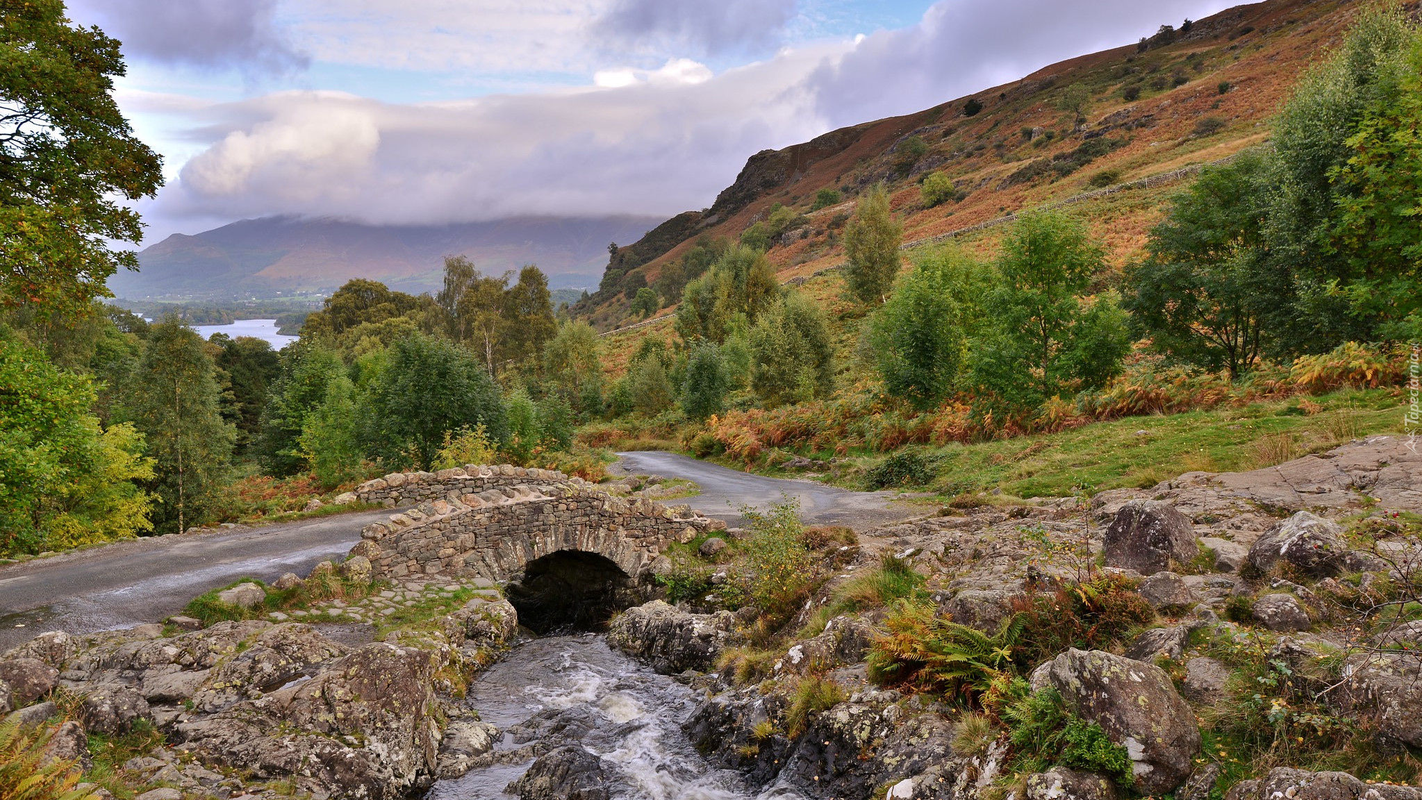 Edytor tapety: Droga przez kamienny most nad rzeką w górach