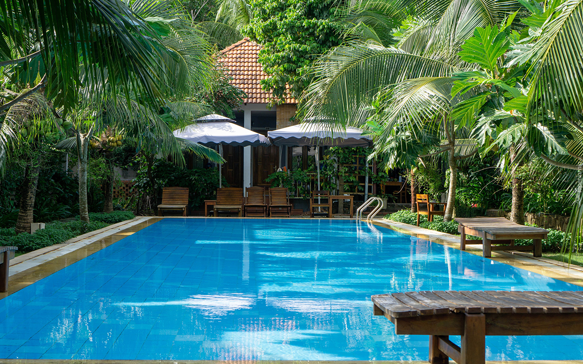 Edytor tapety: Leżaki obok domu nad basenem