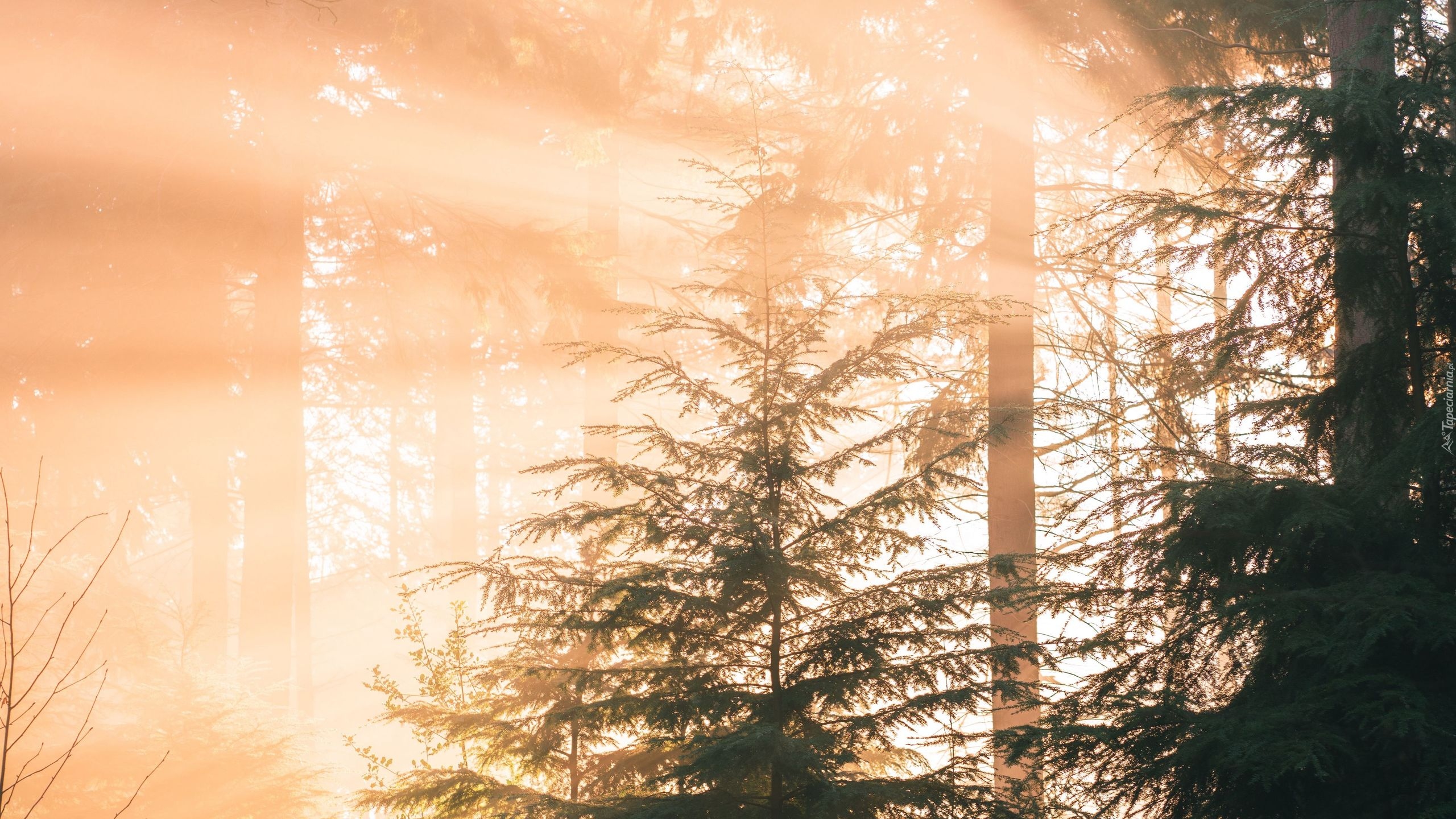 Edytor tapety: Zamglony las w smugach słonecznego światła