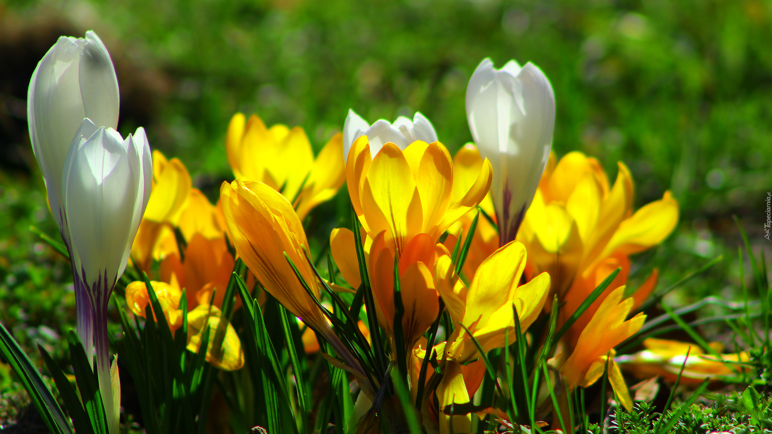 Edytor tapety: Rozświetlone białe i żółte krokusy