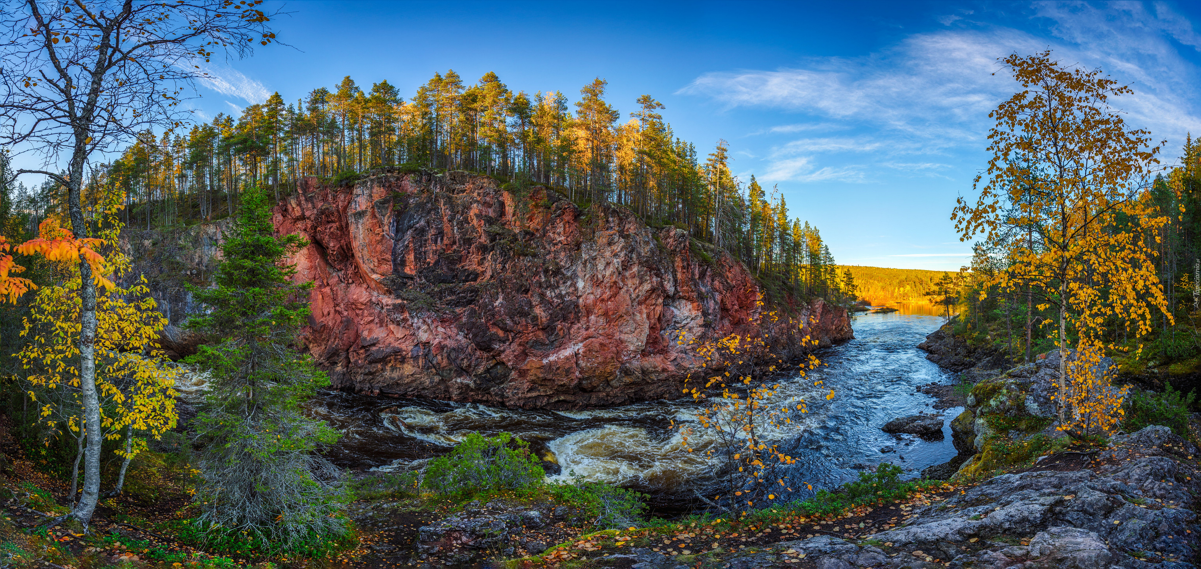 Edytor tapety: Rzeka obok zadrzewionej skały