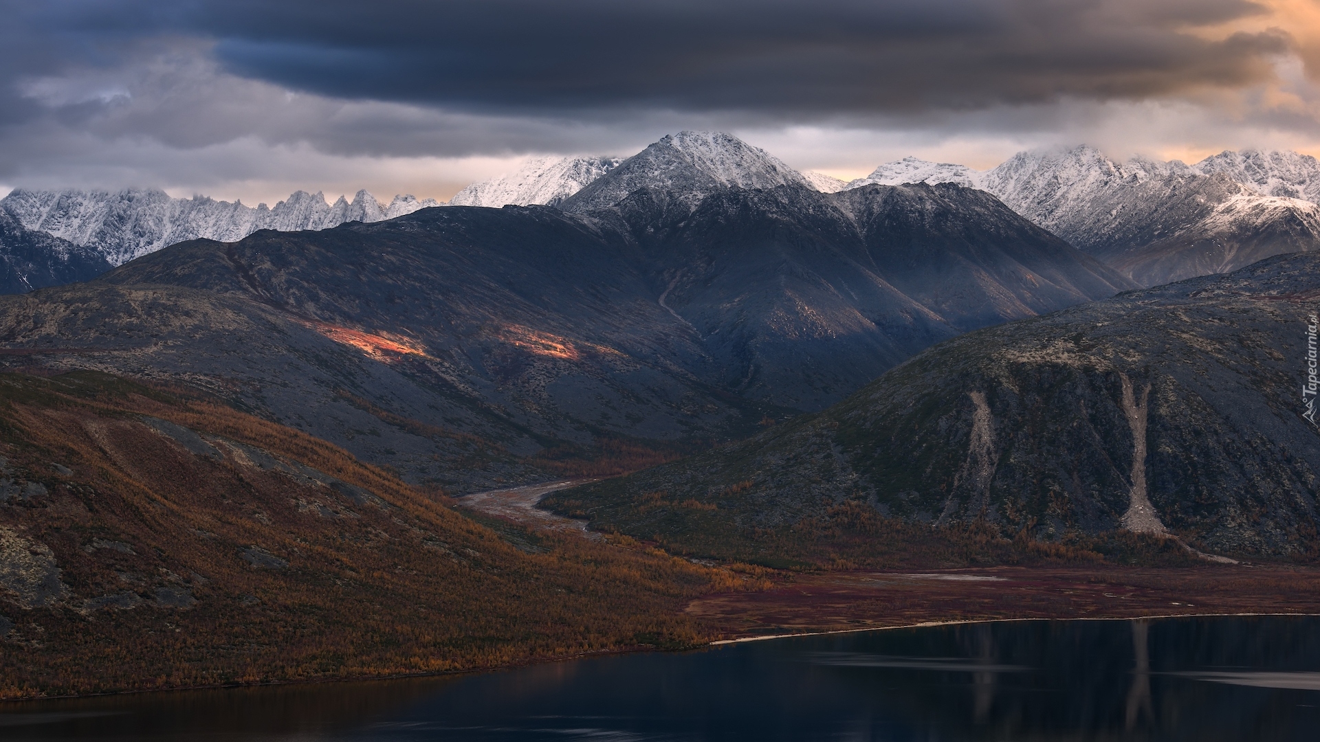 Edytor tapety: Zachmurzone niebo nad górami i jeziorem na Kołymie