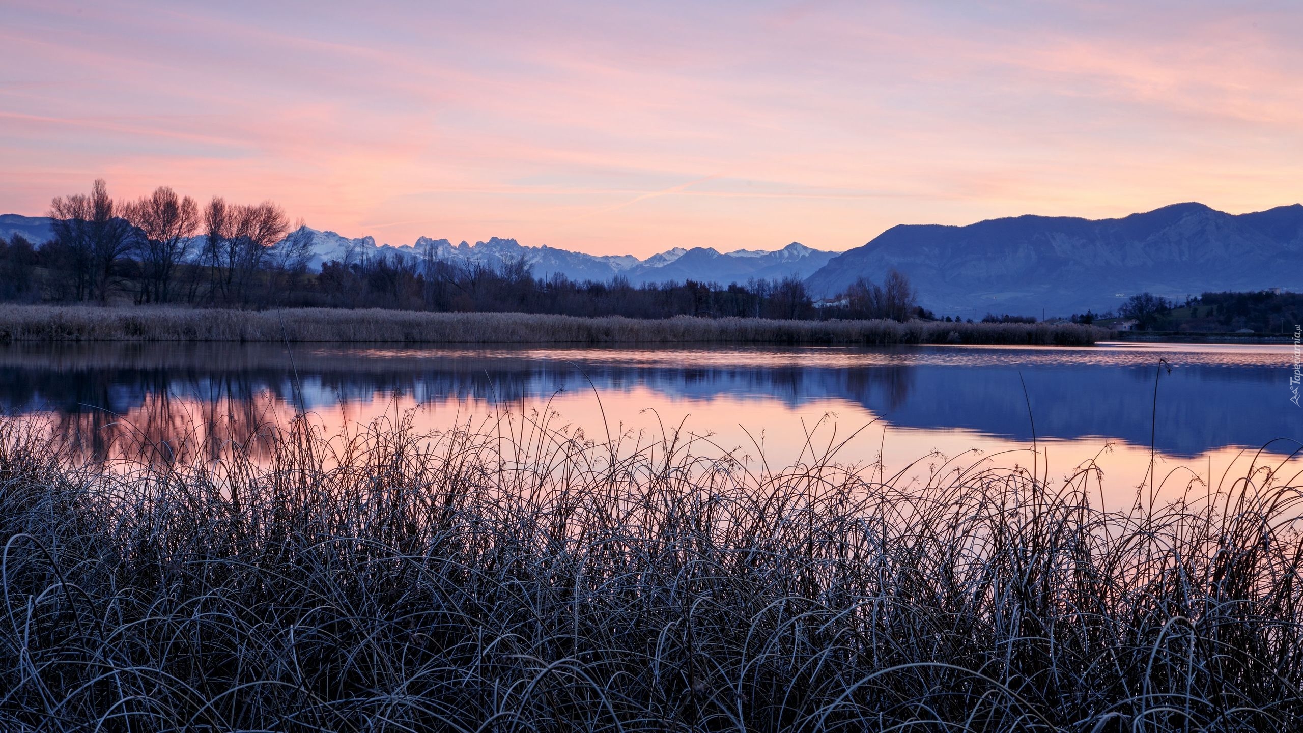 Edytor tapety: Suche trawy i drzewa nad jeziorem w górach