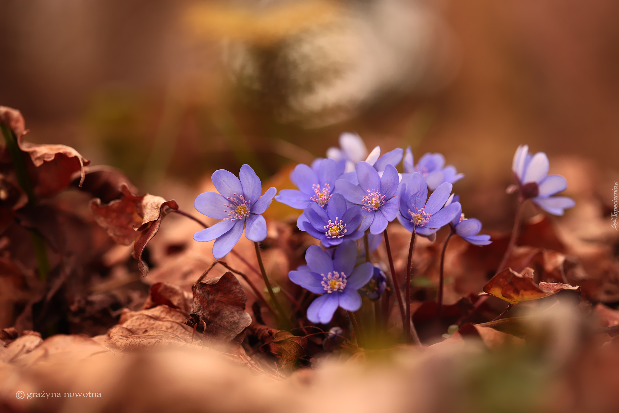 Edytor tapety: Kępka fioletowych przylaszczek w suchych liściach