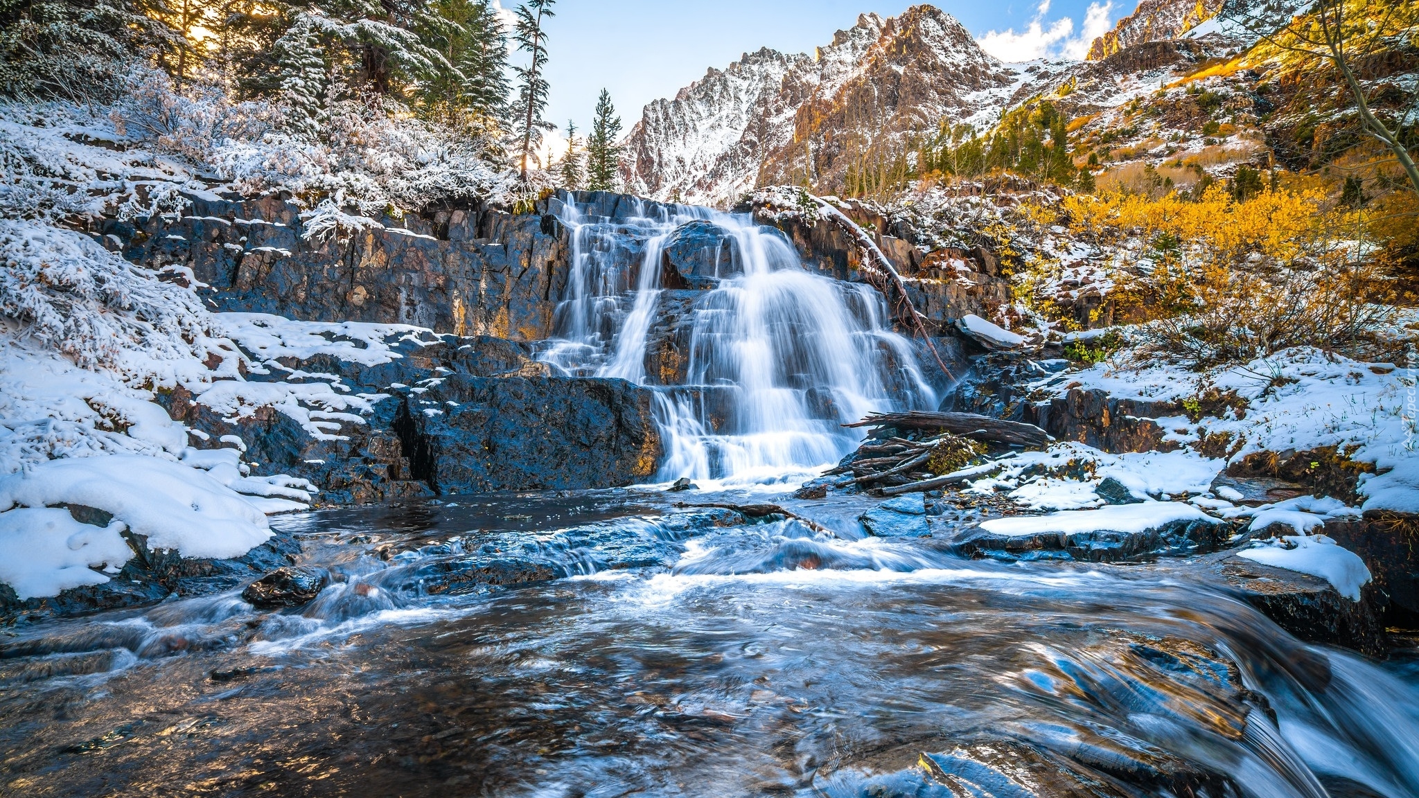 Edytor tapety: Śnieg na skałach i krzewach przy wodospadzie